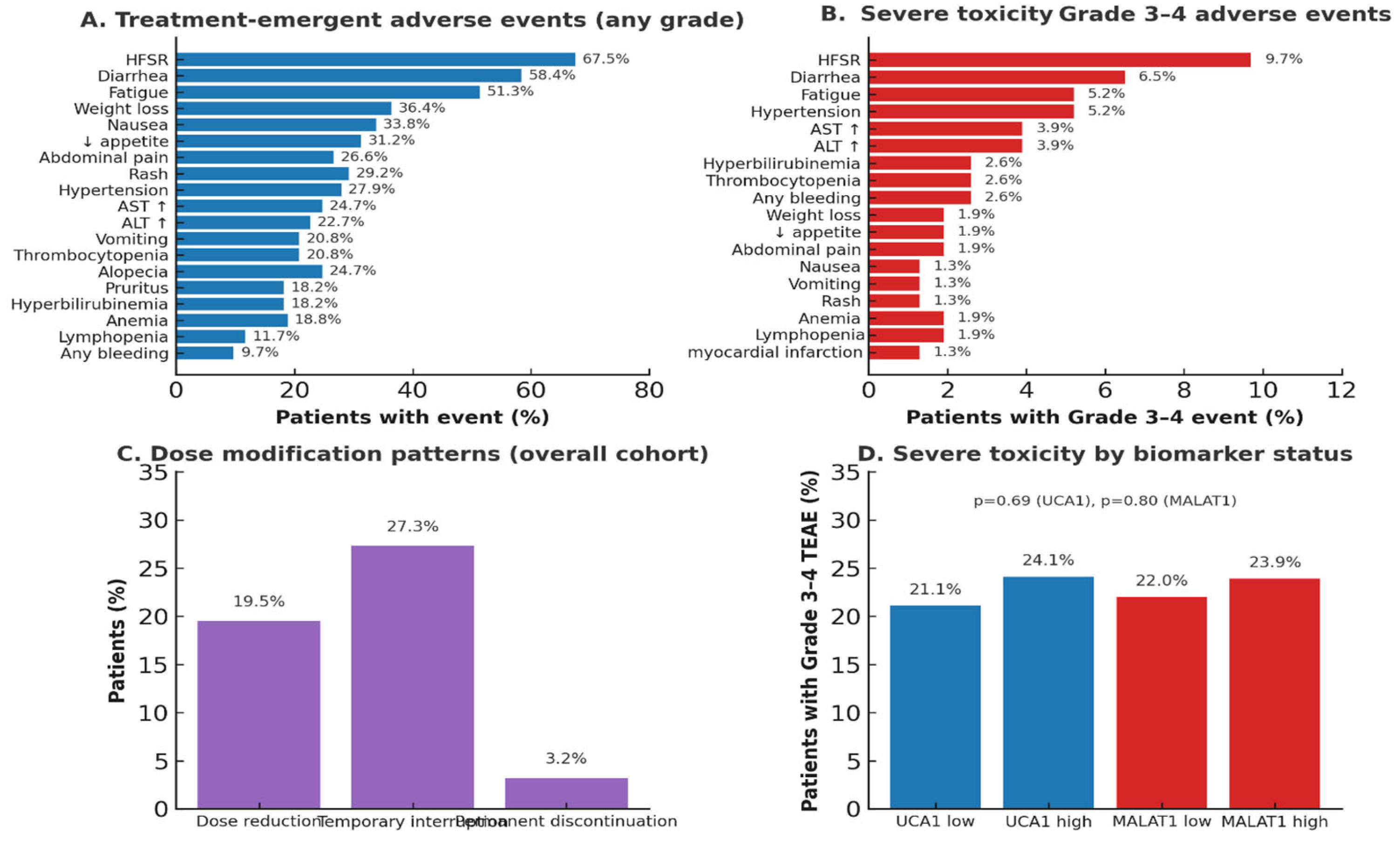 Fourth, the practicalities of clinical care introduce variability. Sorafenib dosing was modified in a portion of our patients due to toxicity. Although these dose reductions and discontinuations were balanced across biomarker groups, indicating that lncRNA levels predict drug efficacy rather than tolerability, this variability in drug exposure can introduce noise into our results. Future studies incorporating pharmacokinetic data would help disentangle true biological resistance from suboptimal dosing effects.