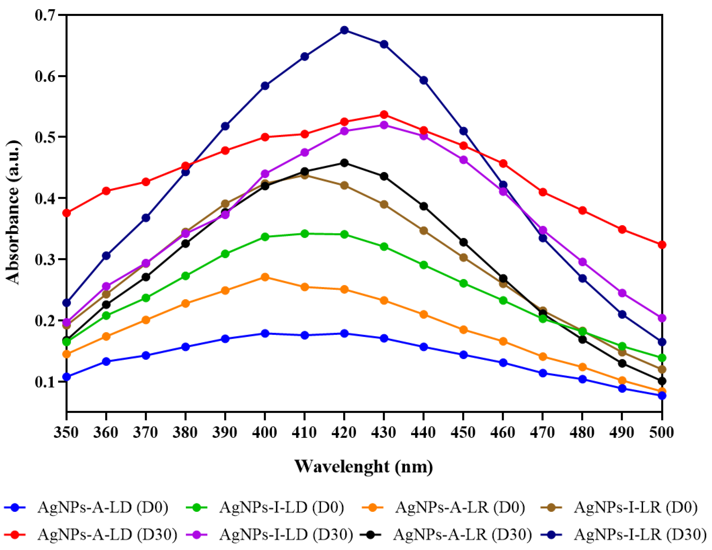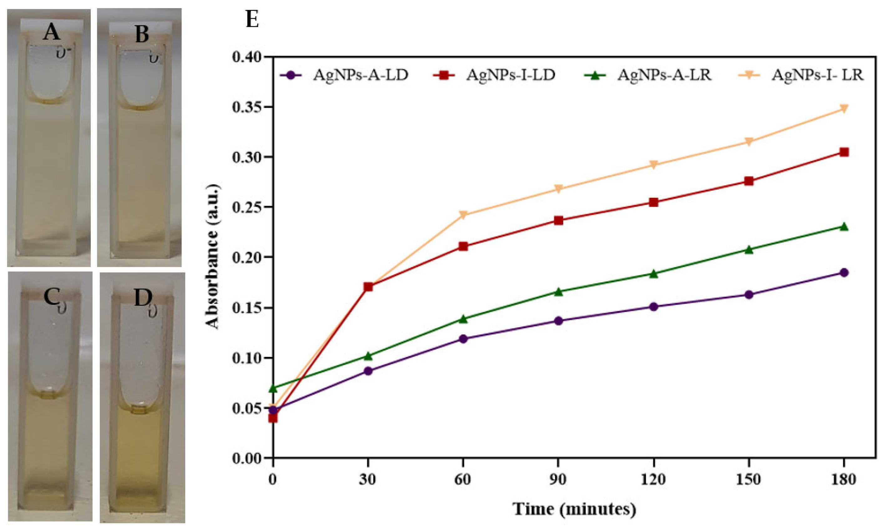 | AgNPs-I-LR | 39.4 ± 16.1 | 3.89 × 109 | 0.342 |