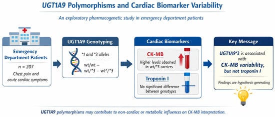 Understanding how the UGT1A9*3 allele elevates the risk of cardiovascular diseases, especially in the case of statin-induced muscle toxicity and ischemia-reperfusion injury, would be clinically valuable. While statin-related myotoxicity could be one reasonable biological process that explains how carriers of the reduced-function UGT1A9 variants isolated CK-MB elevation have, the present study did not have individual statin exposure data. Consequently, any suggestion of an association between the UGT1A9*3 genotype and statin-induced muscle injury would only be a hypothesis worthy of further testing, not a confirmation. It is necessary to investigate in detail the role of impaired drug metabolism and the removal of endogenous toxic compounds in the selective increase of cardiac injury biomarkers in individuals with this genetic variant. Clarifying the different interactions of the *3 allele with cardiac and skeletal muscle based on UGT1A9’s substrate specificity and tissue-specific expression profile will provide more insight into the pathophysiological processes. The observation that Troponin I levels were unaffected by UGT1A9 genotype, while CK-MB showed genotype-associated variability, is consistent with the established specificity and clinical role of contemporary cardiac biomarkers. Importantly, these findings do not challenge current emergency diagnostic algorithms for acute coronary syndrome, which appropriately prioritize troponin as the primary marker of myocardial necrosis. Rather, the potential relevance of UGT1A9-associated CK-MB variability may be confined to more specific clinical contexts in which CK-MB is still considered a complementary marker, such as the evaluation of suspected reinfarction after revascularization procedures or in complex clinical scenarios where troponin interpretation may be limited. Within this narrower framework, genetic modulation of CK-MB levels may represent a confounding factor that warrants consideration, rather than a determinant of primary diagnosis.