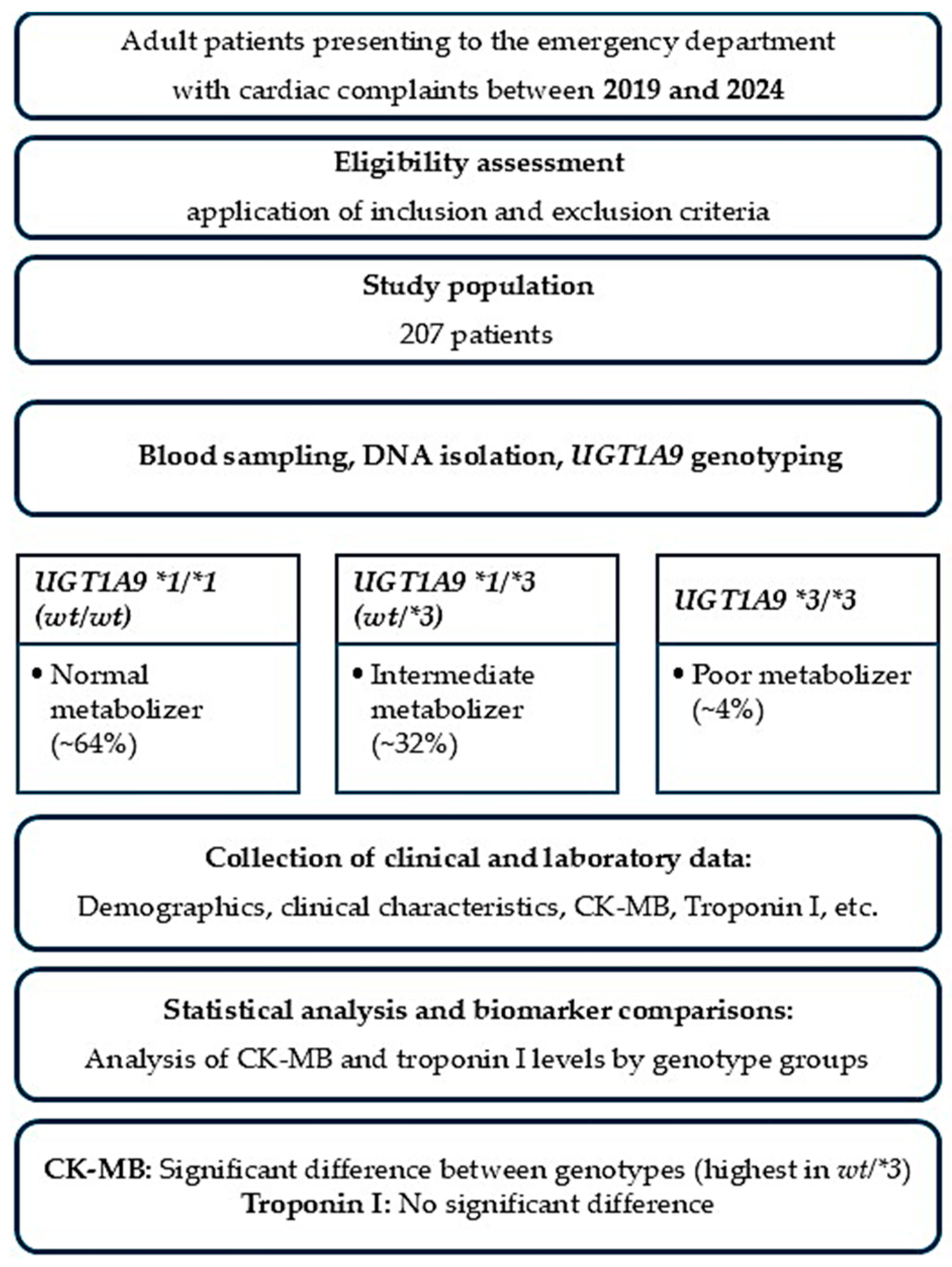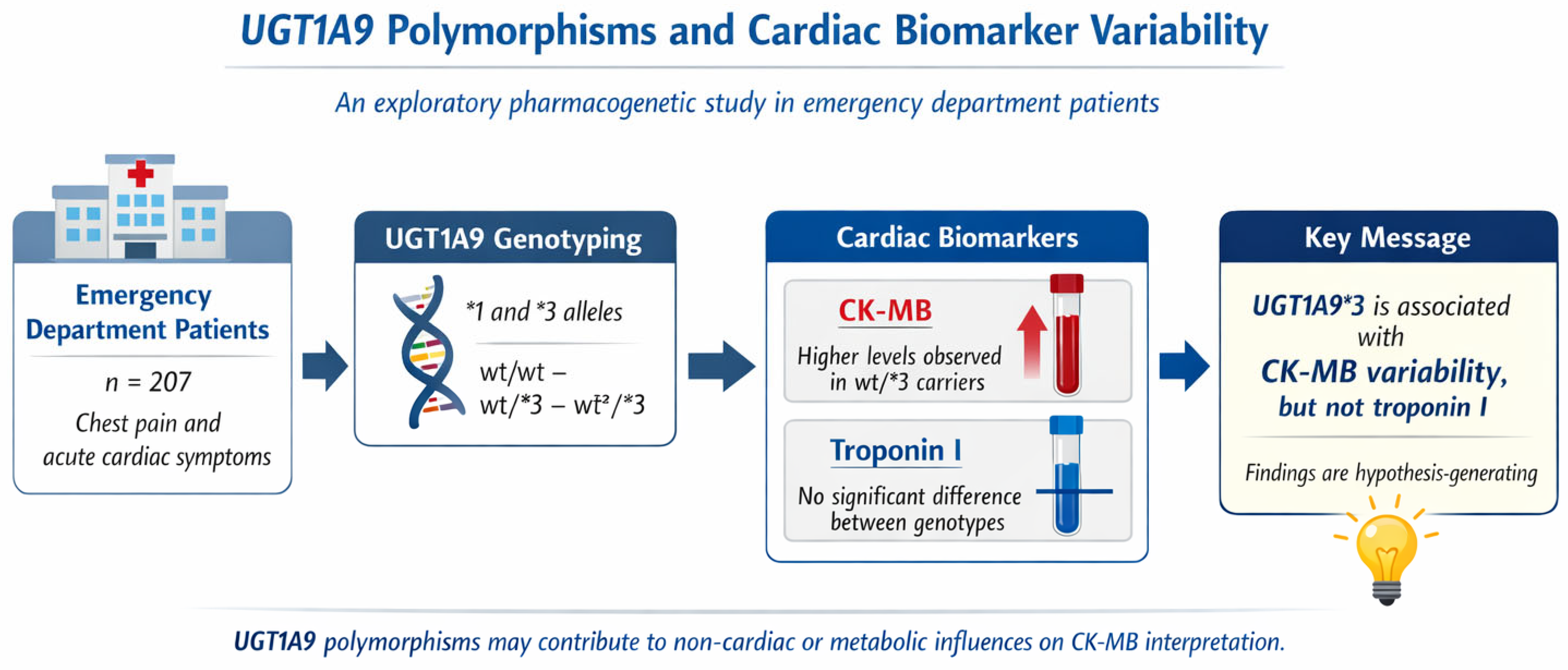 An important limitation of the present study is the reliance on biomarker variability, particularly CK-MB, as the primary outcome measure. Although CK-MB has historically been used in the assessment of cardiac injury, it represents a surrogate biomarker with limited specificity and is influenced by multiple confounding factors, including skeletal muscle injury, systemic inflammation, renal function, and drug-related effects. Therefore, the observed association between UGT1A9*3 genotype and CK-MB levels should be interpreted cautiously and viewed as hypothesis-generating rather than indicative of direct myocardial damage or clinical outcomes. Future studies incorporating more specific endpoints, longitudinal clinical follow-up, and detailed medication exposure data will be necessary to clarify the clinical significance of these findings.