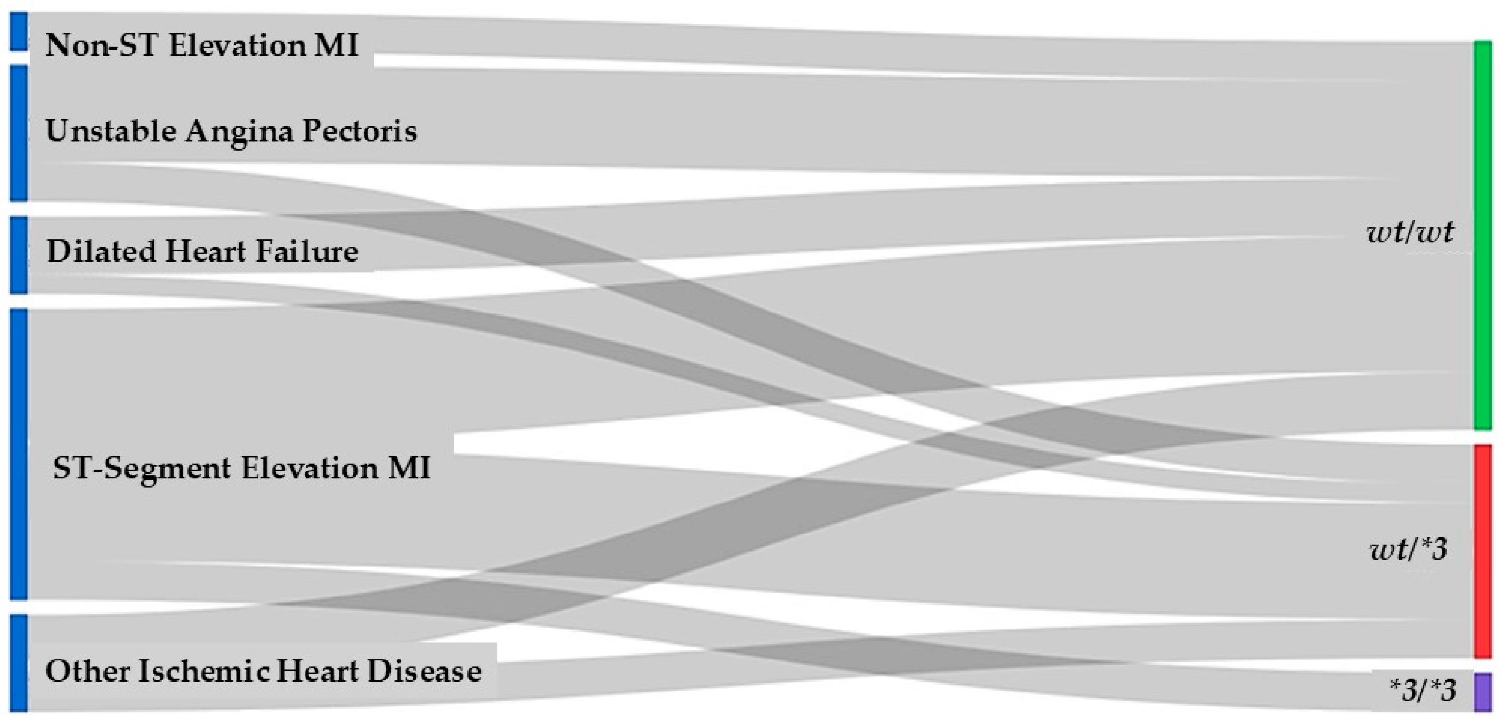 Patients with NSTEMI, STEMI, and other ischemic heart disease contributed the largest flows into the wt/wt category, reflecting the predominance of the wild-type genotype in both acute coronary syndromes and chronic ischemic disease. However, these diagnostic groups were also represented among wt/*3 and *3/*3 patients, indicating that carriage of the *3 allele is not restricted to a particular clinical presentation. Similarly, dilated heart failure and unstable angina pectoris showed contributions to each of the three genotype classes, with no visually apparent clustering of a specific genotype within any single diagnostic category.