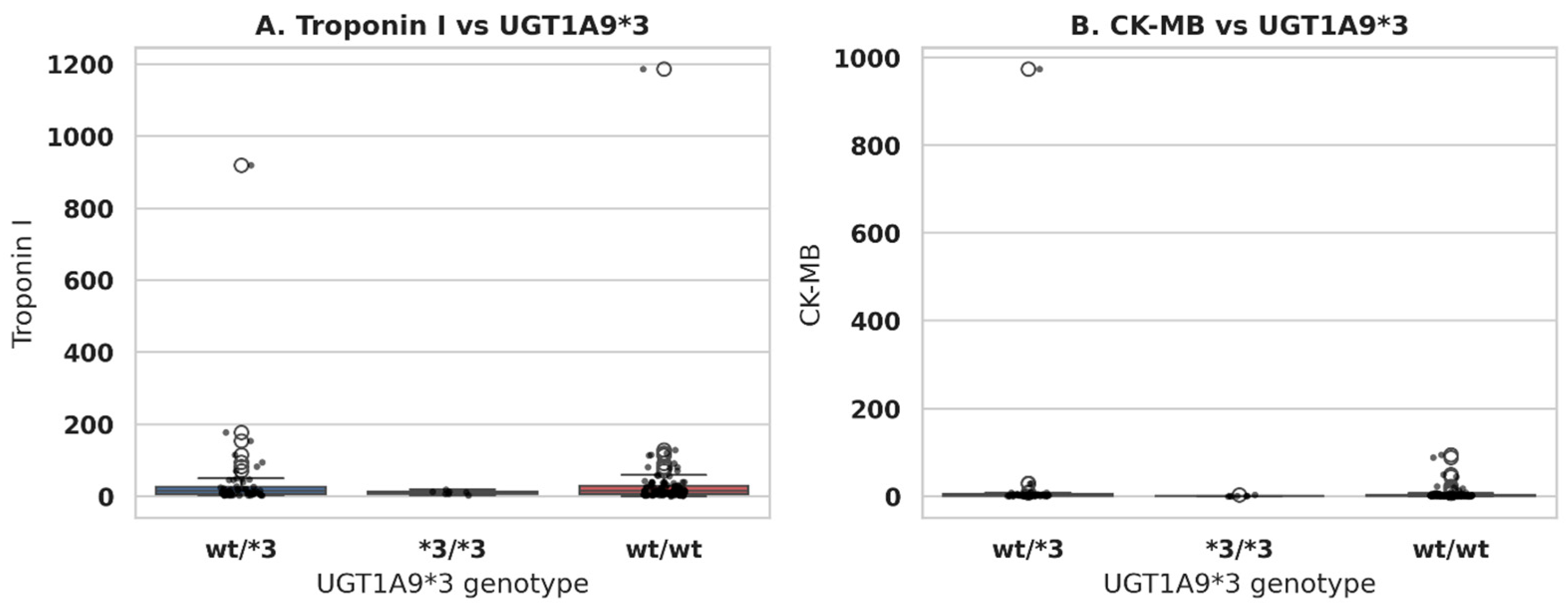 UGT1A9*3 genotypes and cardiac biomarkers was evaluated using serum Troponin I and CK-MB levels in the overall cohort (