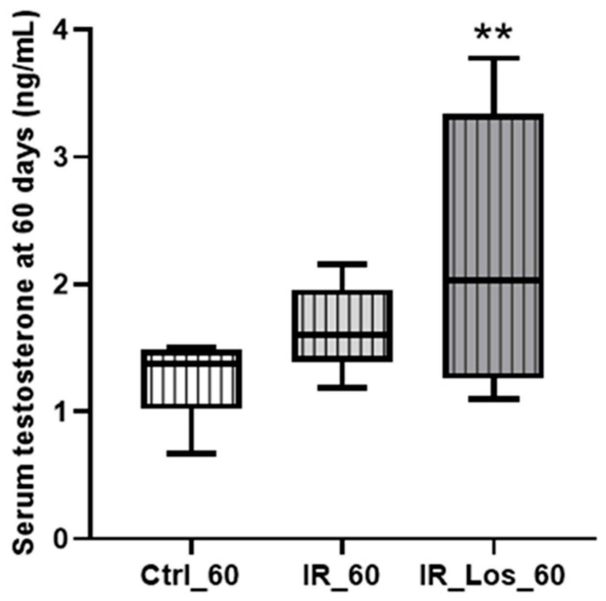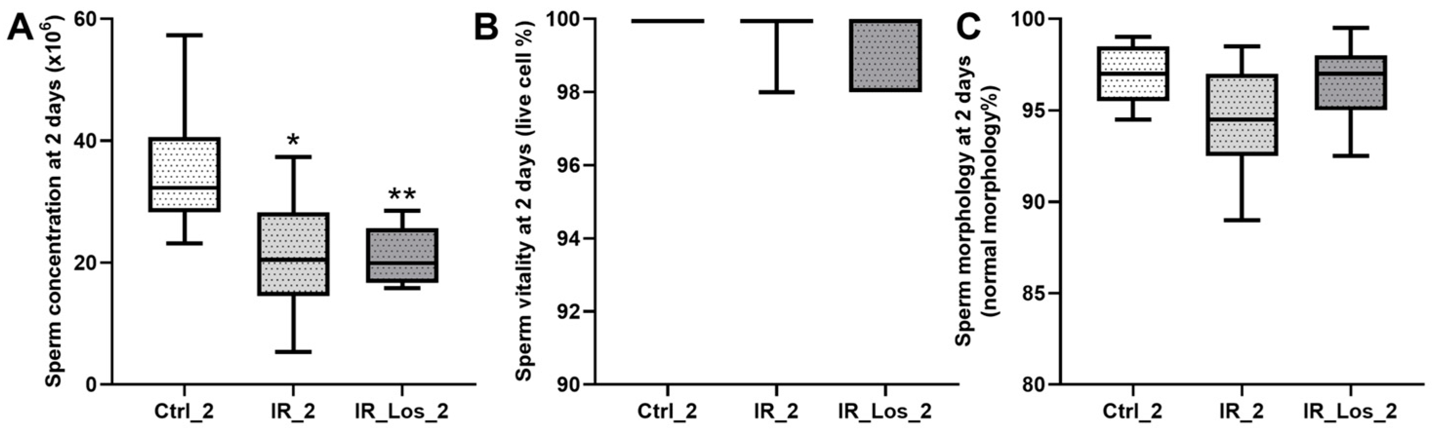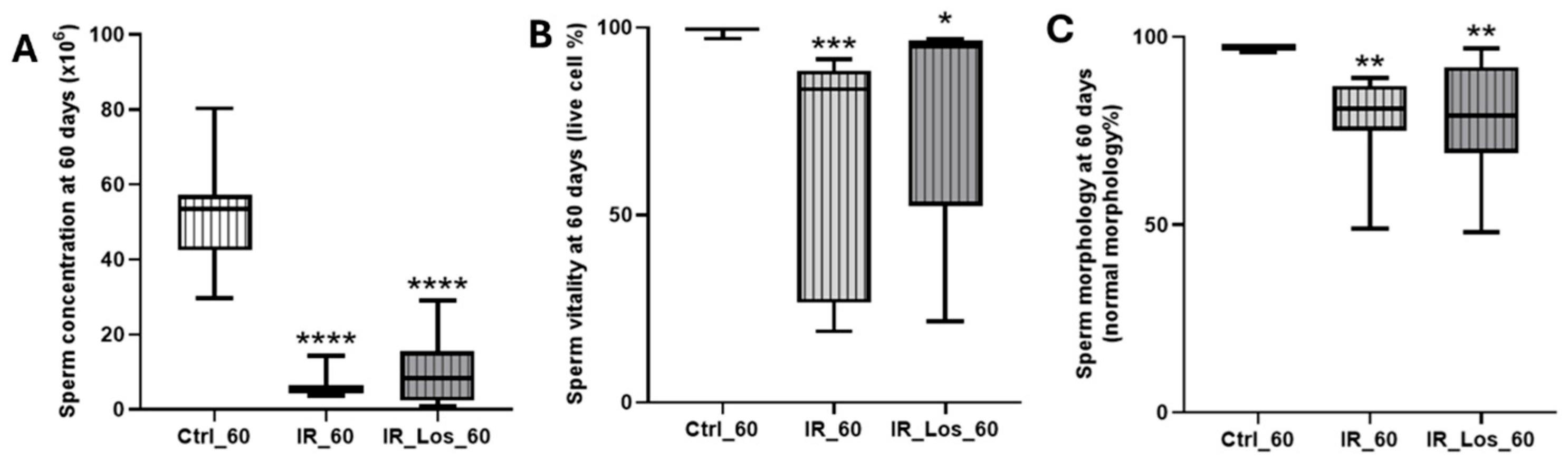 2.2. Losartan Increased Serum Testosterone in Rats Late Post-Radiotherapy but Did Not Fully Restore Sperm Quality