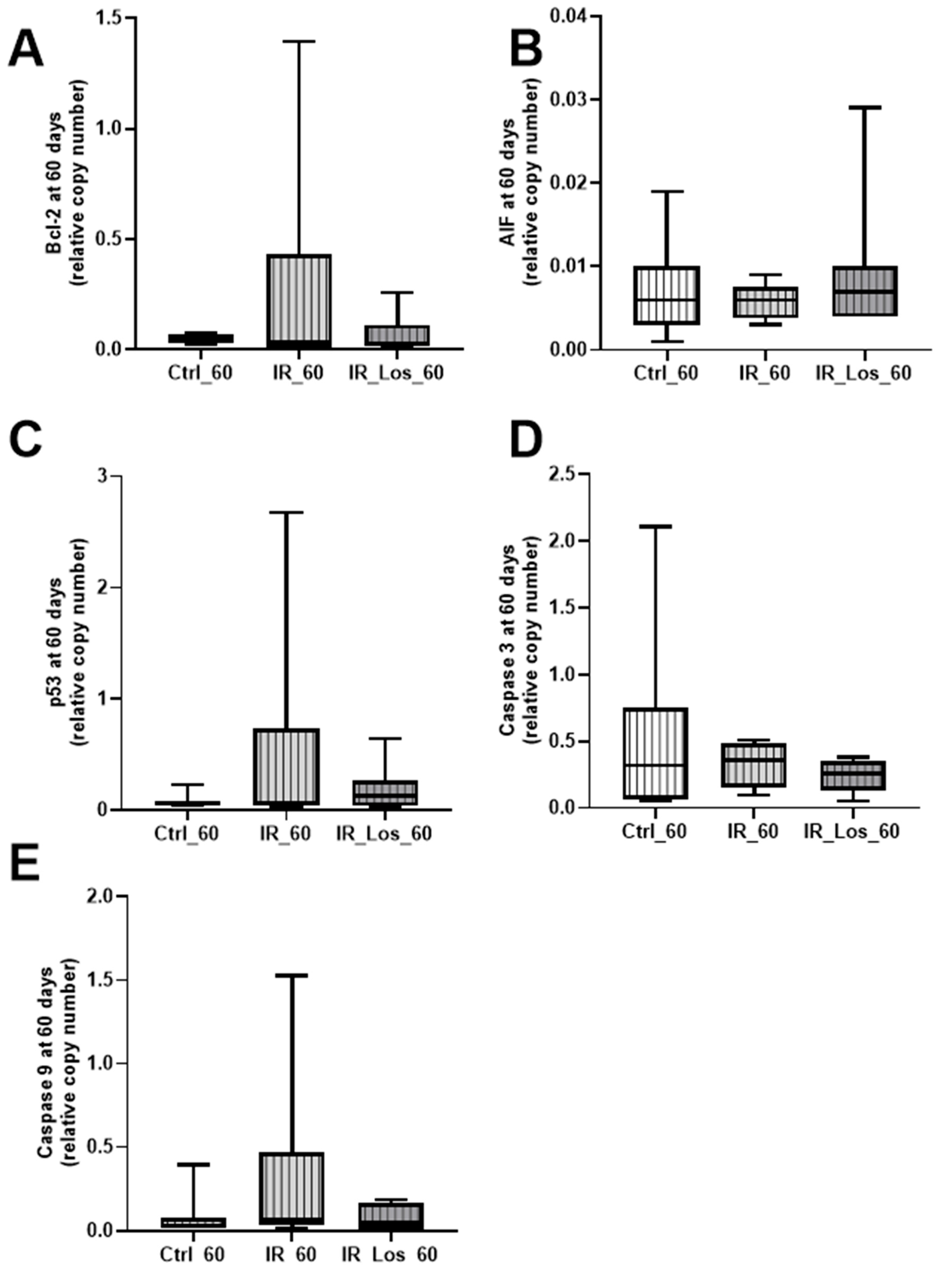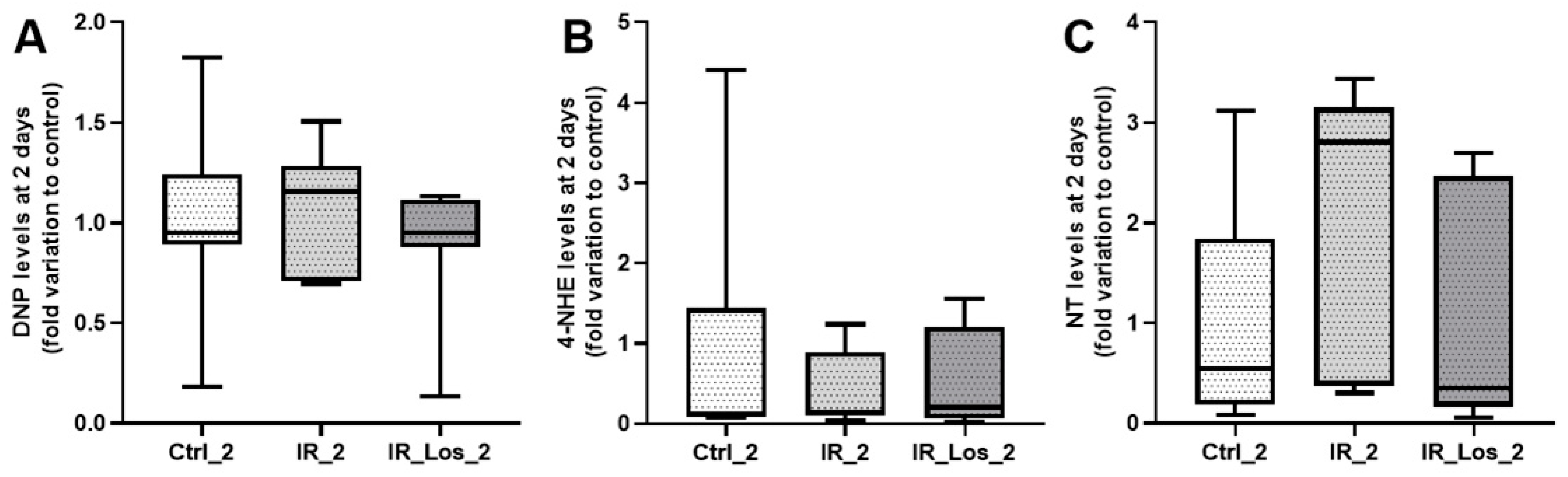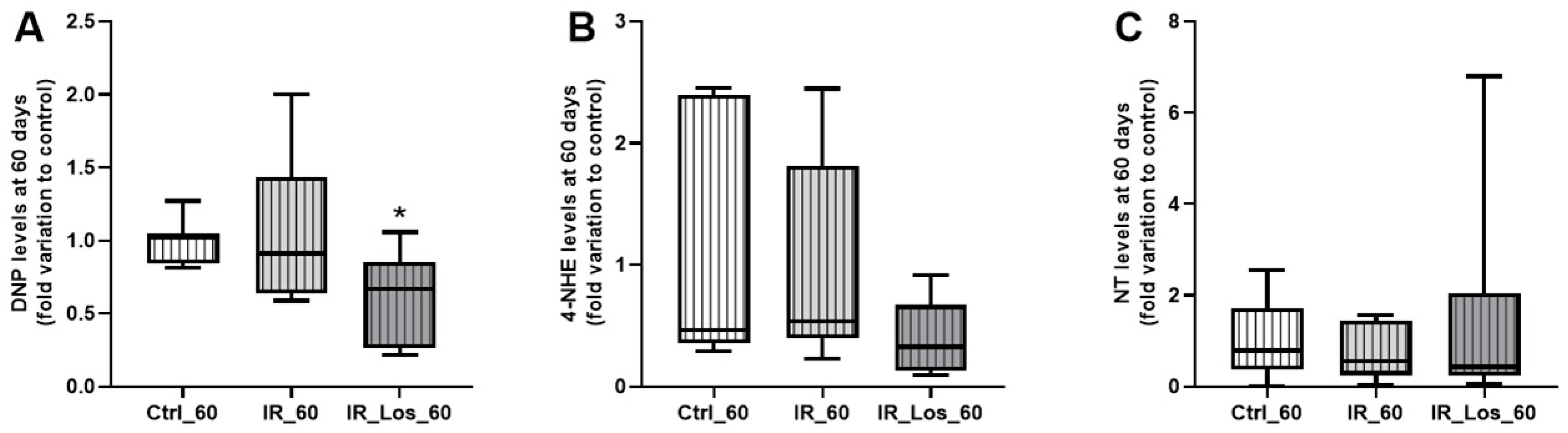 2.3. Losartan Failed to Mitigate Acute Post-Radiotherapy Testicular Oxidative Stress-Related Damage, but Significantly Reduced Late Effects on Protein Carbonylation in the Testes of Rats