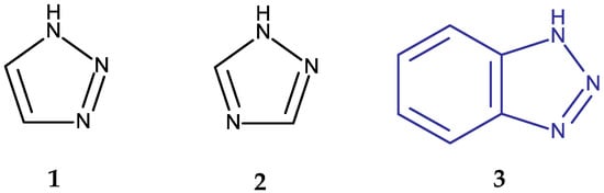 Chemical structures of 1,2,3-triazole (1), 1,2,4-triazole (2), and 1H-benzotriazole (3).