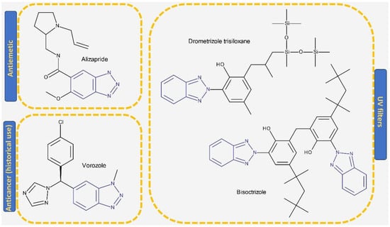 Structure of drugs and commercially available substances incorporating the benzotriazole heterocycle.