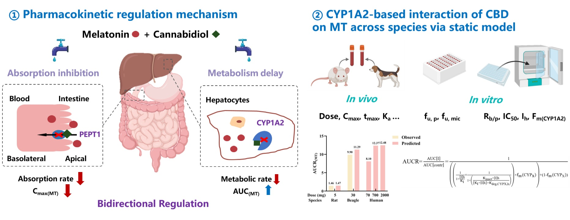 Despite the valuable findings of this study, several limitations should be acknowledged: First, the CBD doses employed in animal experiments may not fully encompass the clinically relevant concentration range, which could restrict the translational relevance of the observed in vivo DDI patterns. Second, the specific contribution of the PEPT1 transporter to MT’s intestinal absorptive process in humans, as well as its associated quantitative parameters (e.g., transport efficiency, fraction absorbed via PEPT1), has not been directly verified, limiting the accuracy of extrapolating intestinal absorption regulation mechanisms to the human population. Additionally, this study only investigated the impact of CBD on the pharmacokinetics profiles of MT; given that CBD itself exhibits sleep-regulating properties, the direct influence of their co-administration on MT’s pharmacodynamic effects (e.g., sleep initiation/sustainment efficacy) remains to be further elucidated.