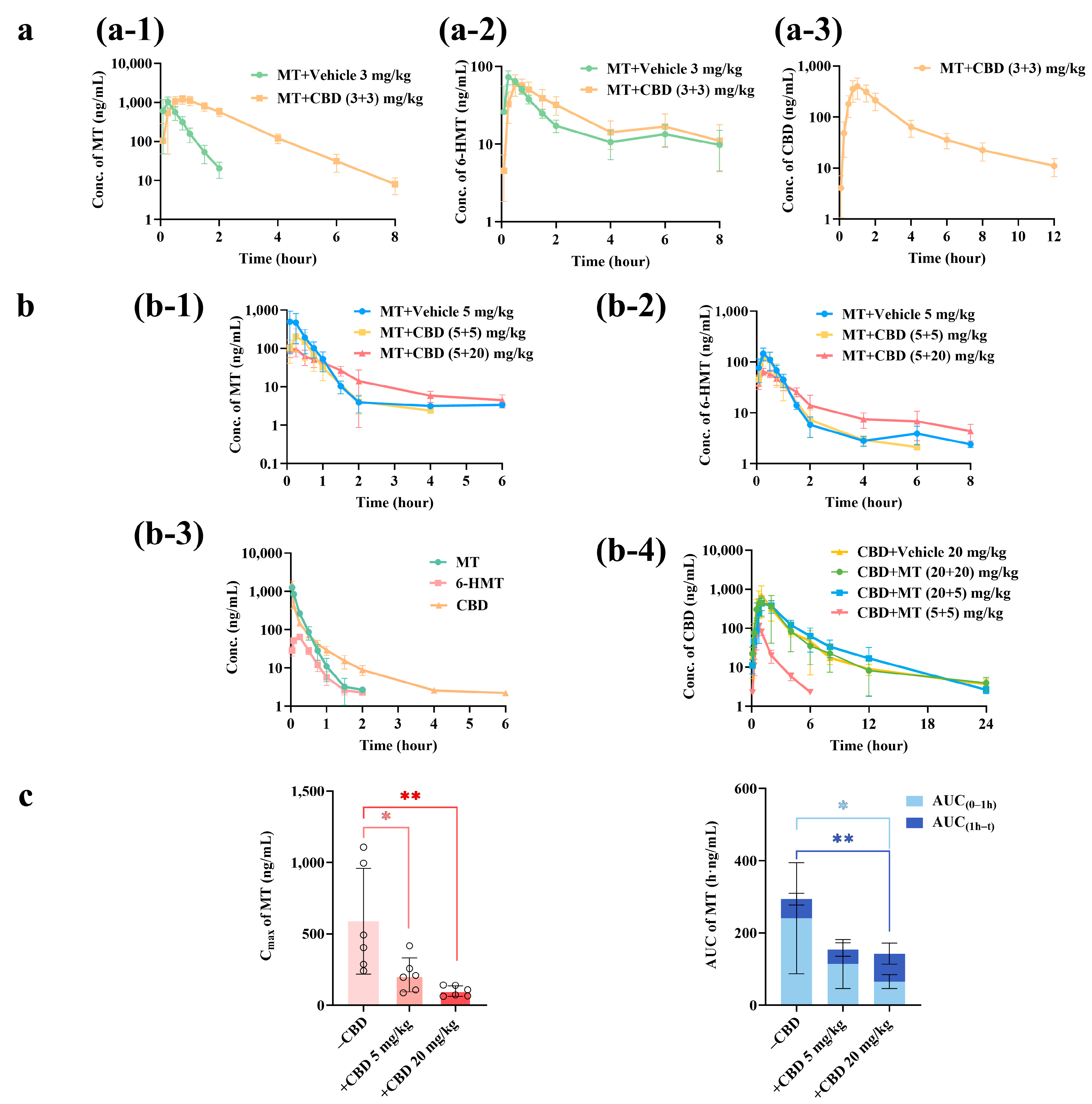 SPSS 29.0.2.0 software was used to perform unpaired t-tests on the pharmacokinetic parameters (including Cmax and AUC) of MT in the MT alone group and the MT combined with CBD group, aiming to analyze the effect of CBD on the in vivo exposure of MT and 6-HMT. Similarly, the effect of MT on the pharmacokinetics of CBD was statistically analyzed using the same method. A p-value < 0.05 was considered statistically significant, and p < 0.01 was regarded as statistically highly significant.