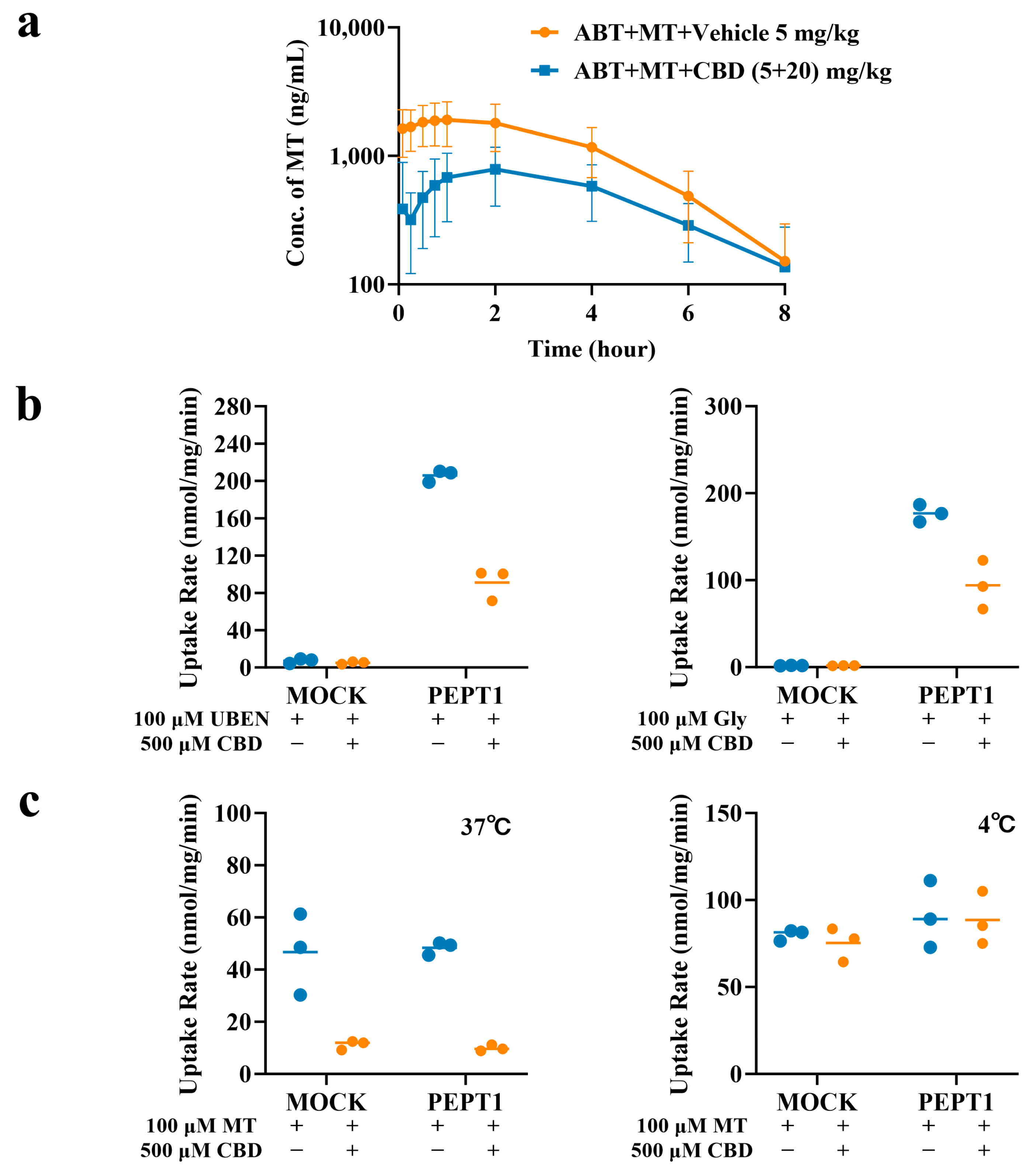 32] and the amphiphilic properties of MT (which are similar to those of PEPT1 substrates), it was hypothesized that PEPT1 may serve as a key transporter mediating the intestinal absorption of MT. To verify this mechanism, the effect of CBD on MT uptake into cells was investigated in MDCK cells expressing PEPT1. PEPT1 is a transporter in intestinal epithelial cells that actively uptakes small peptides and certain drugs through an H