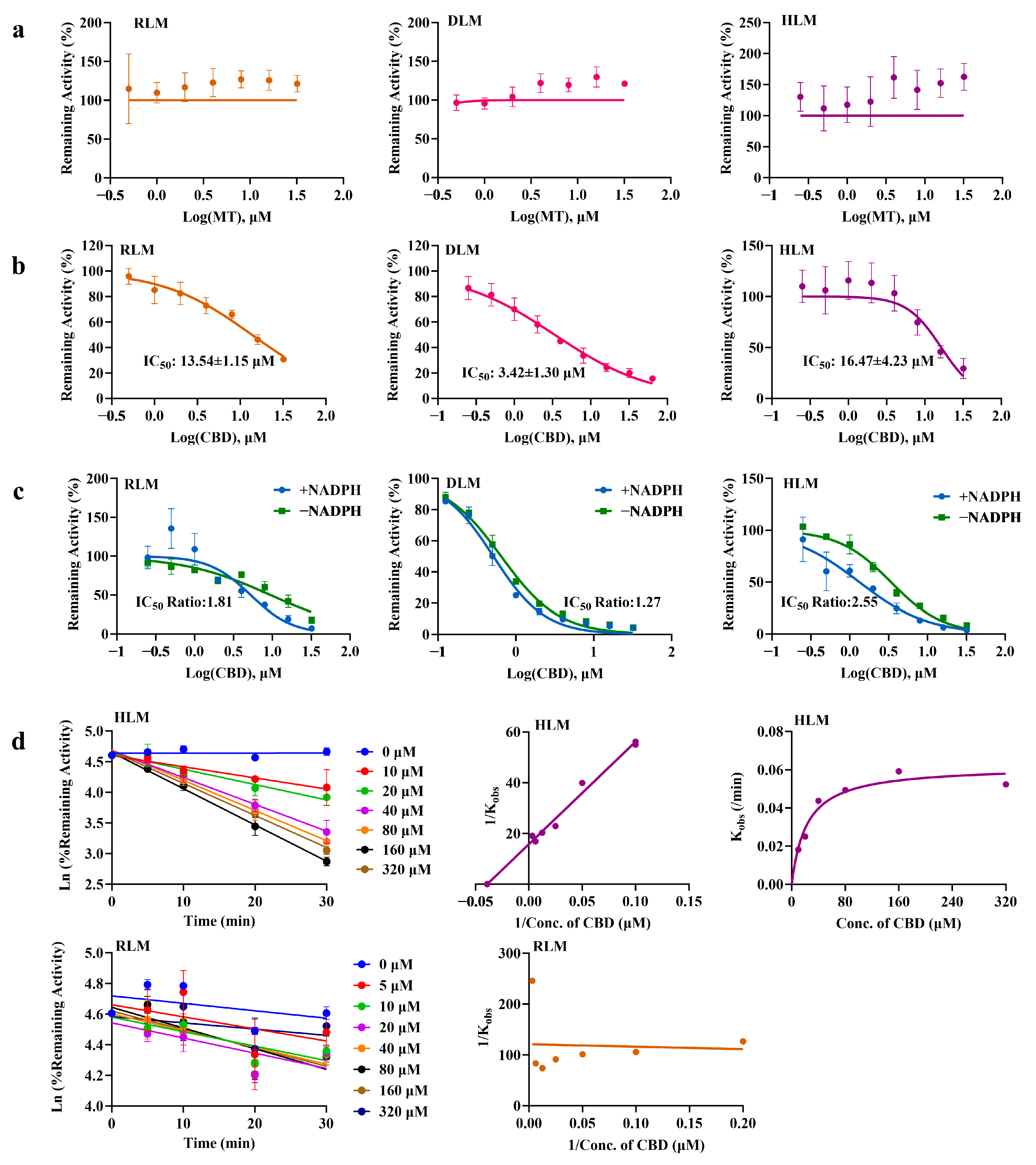 Different concentrations of CBD were added to human and rat liver microsome incubation solutions, followed by pre-incubation at 37 °C for 5 min. The reaction was initiated by adding the NADPH working solution that had also been pre-incubated for 5 min. The primary incubation system contained 100 mM PBS, 5 mM MgCl2, 1 mg/mL liver microsomal protein, 1 mM NADPH, 0.2% BSA, and CBD at final concentrations of 0, 10, 20, 40, 80, 160, and 320 μM (with DMSO content < 0.1% and total organic solvent content < 1% in the system). After pre-incubation for different durations (0, 5, 10, 20, 30 min), 10 μL of the incubation mixture were transferred to a secondary incubation system containing 148 μL PBS and 2 μL MT working solution (final MT concentration: 200 μM). An additional 40 μL of NADPH were added, and the mixture was incubated for 30 min. Subsequently, 20 μL of the sample were mixed with 180 μL of ice-cold acetonitrile (containing 10 ng/mL MT-D4) and vortexed for 1 min to terminate the reaction. All samples were prepared in triplicate, and the content of 6-HMT was determined by LC-MS/MS.