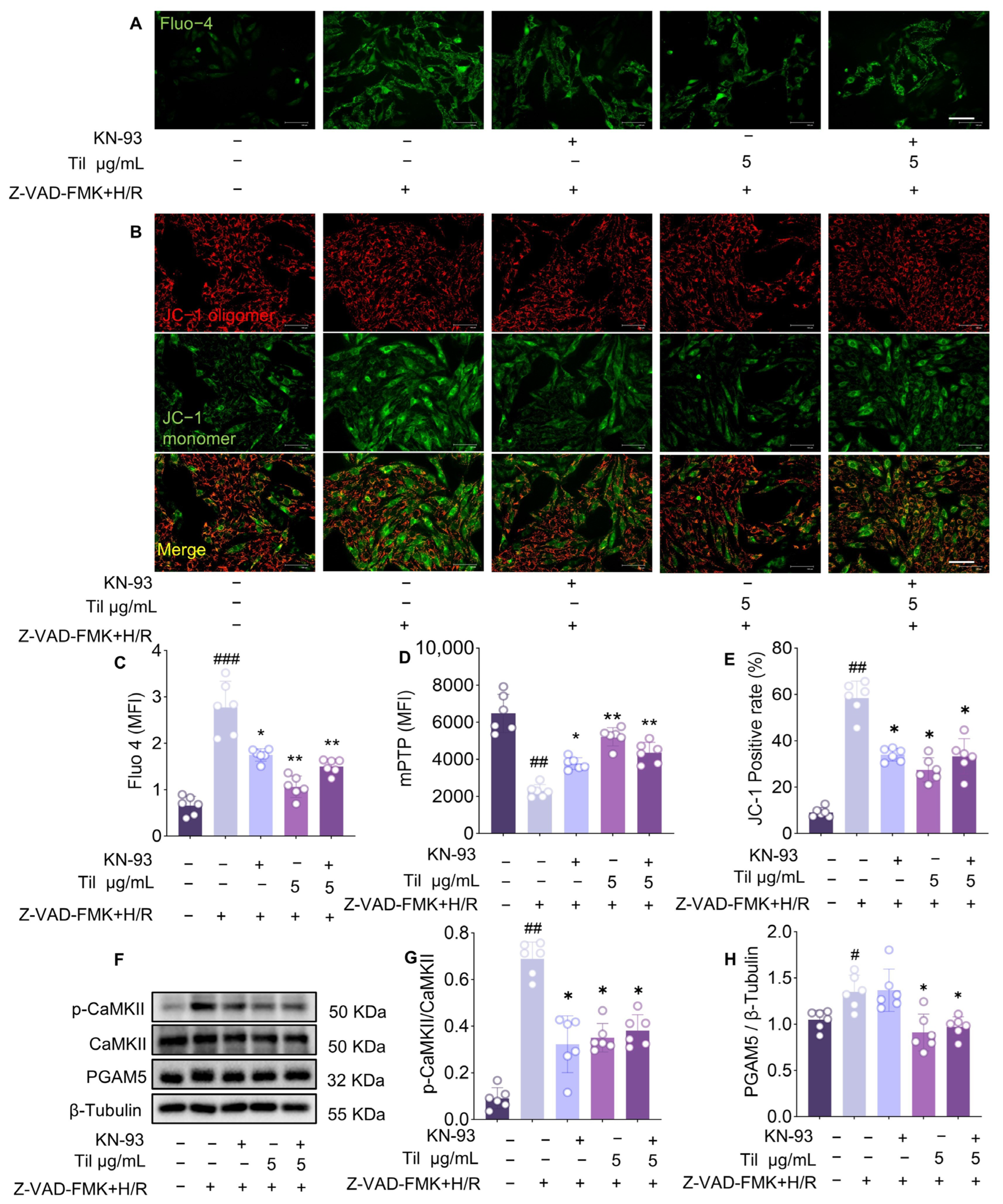 2.8. Blockade of CaMKII Abolishes the Protective Effect of Til on Cardiomyocytes Impaired by Z-VAD-FMK + H/R Injury
