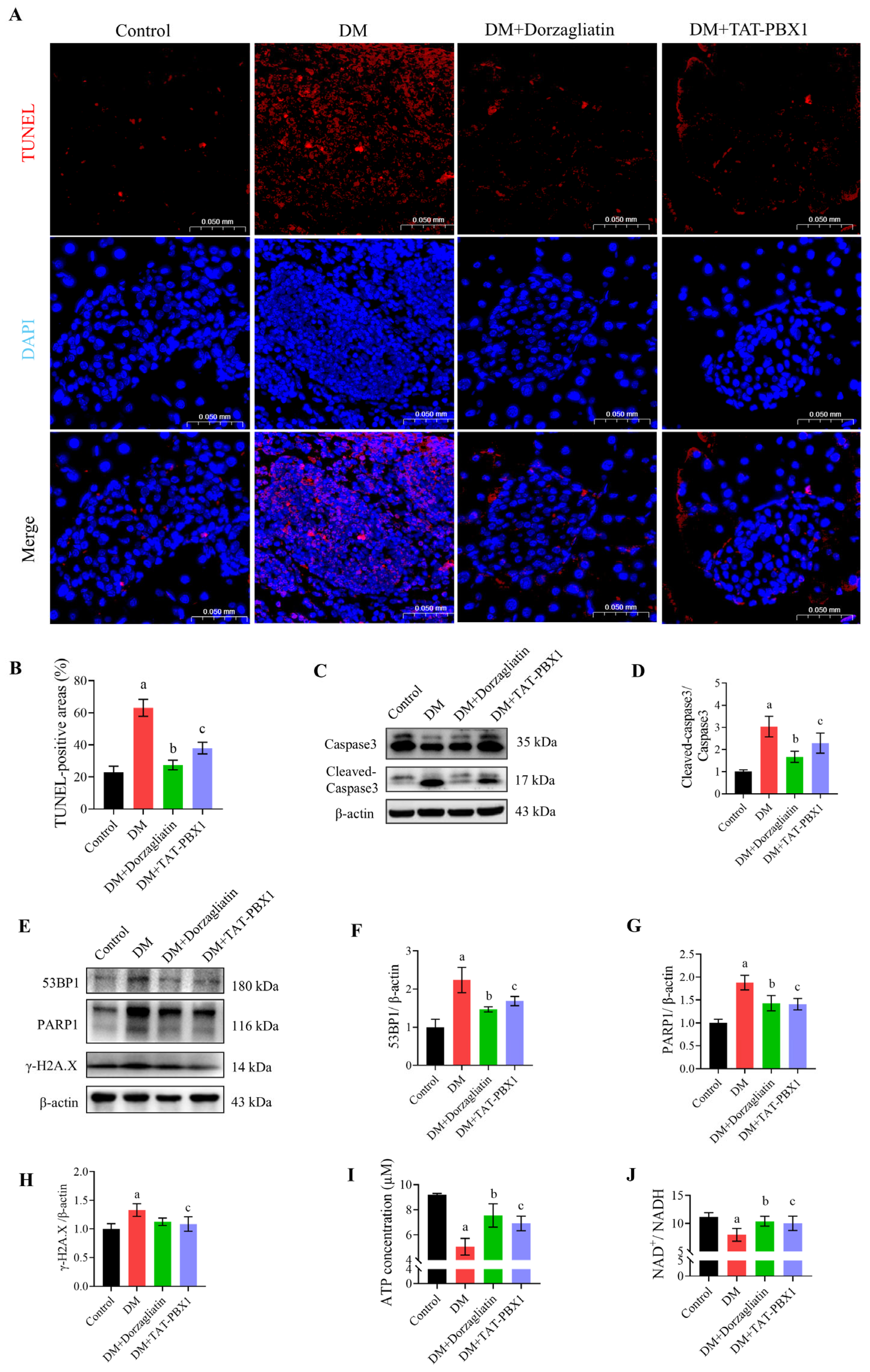 2.2. TAT-PBX1 Reduces STZ-Induced DNA Damage and Apoptosis in MIN6 Cells and Partially Restores Energy Supply