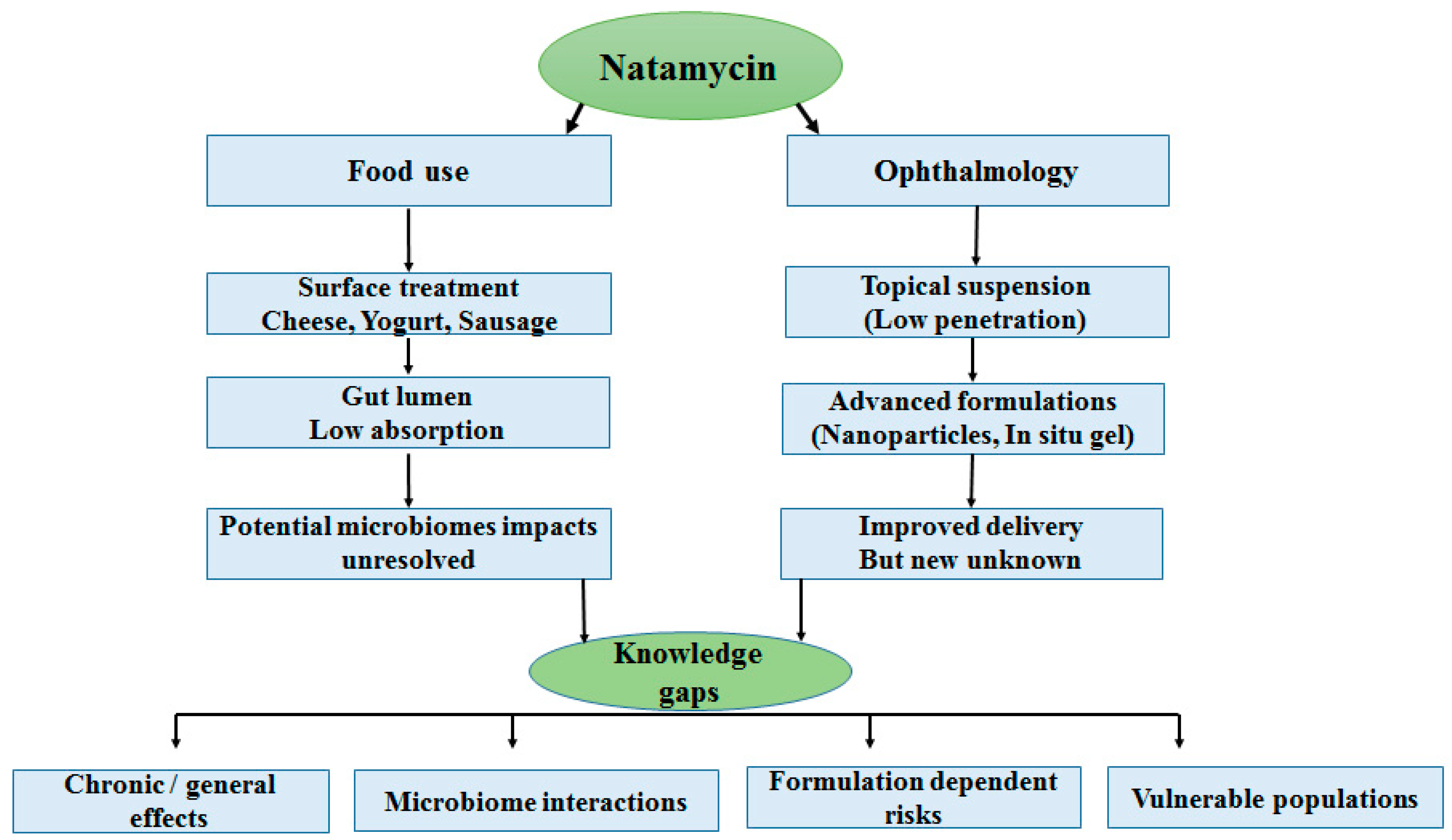 | Natamycin (food preservative) | Human exposure model | Oral (dietary) | Not specified; enhanced with cyclodextrins | Chronic dietary exposure | Effects on gut flora, resistance development, dietary safety thresholds | [55] |