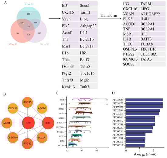 To identify key regulators underlying TAN subtype polarization, we first compared DEGs across N1 vs. N, N2 vs. N, and N1 vs. N2. A Venn diagram revealed 26 overlapping genes, of which 25 human orthologs were retained for further analysis (Figure 2A). Using the MCC algorithm, nine genes—TNF, IL1B, PTGS2, BCL2A1, MSR1, ACOD1, CXCL16, CLEC10A, and SOCS3—were identified as top hub genes. Among these, TNF, IL1B, PTGS2, BCL2A1, MSR1, ACOD1, and CXCL16 exhibited higher expression in N1, whereas CLEC10A and SOCS3 were predominantly upregulated in N2 (Figure 2B).