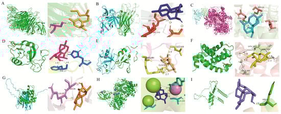 Molecular docking conformations of DHA with hub genes. (A–I) Predicted binding modes between DHA and the protein products of TNF, IL1B, PTGS2, CLEC10A, MSR1, BCL2A1, SOCS3, ACOD1 and CXCL16, respectively.