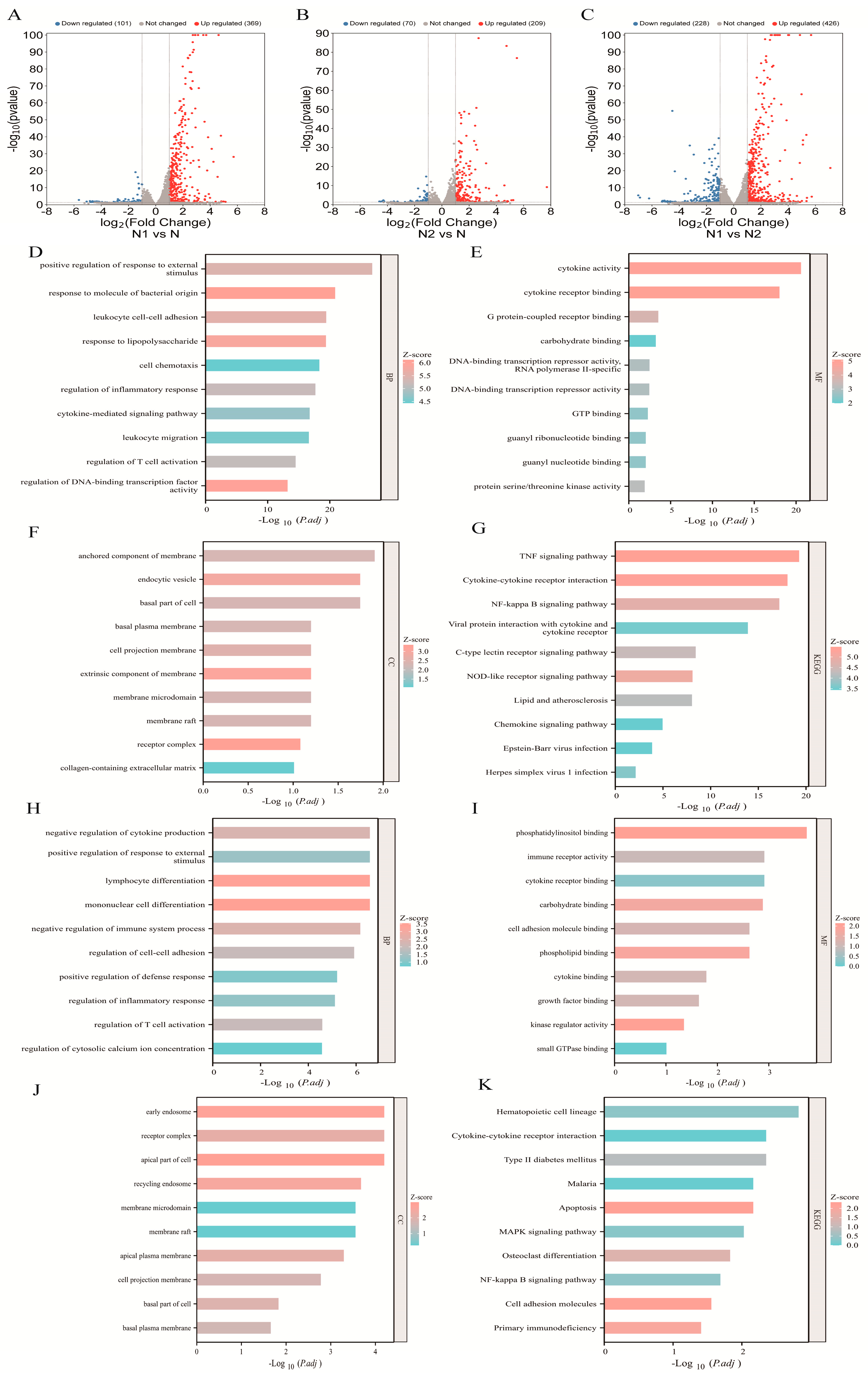 Figure 1. Bioinformatic analysis of E-MTAB-1050. (AC) Volcano plots of DEGs between the N1 vs. N, N2 vs. N and N1 vs. N2 subtypes. (DG) GO biological processes, molecular functions, cellular components, and KEGG pathway analysis of DEGs between the N1 and N subtypes; (HK) GO biological processes, molecular functions, cellular components, and KEGG pathway analysis of DEGs between the N2 and N subtypes.
