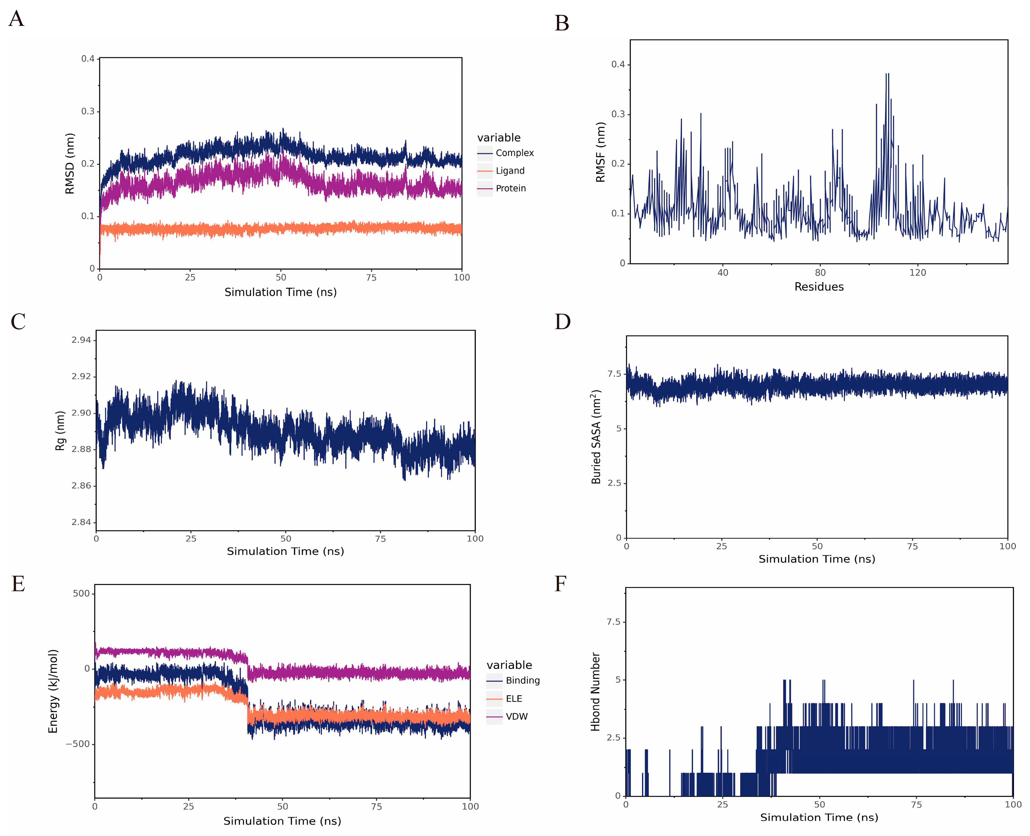Figure 4. (A) RMSD of DHA and TNF. (B) RMSF of the protein in the complex. (C,D) Rg and Buried SASA between DHA and TNF of the complex. (E) Van der Waals and electrostatic contributions to the binding energy between small molecules and proteins. (F) Number of hydrogen bonds.