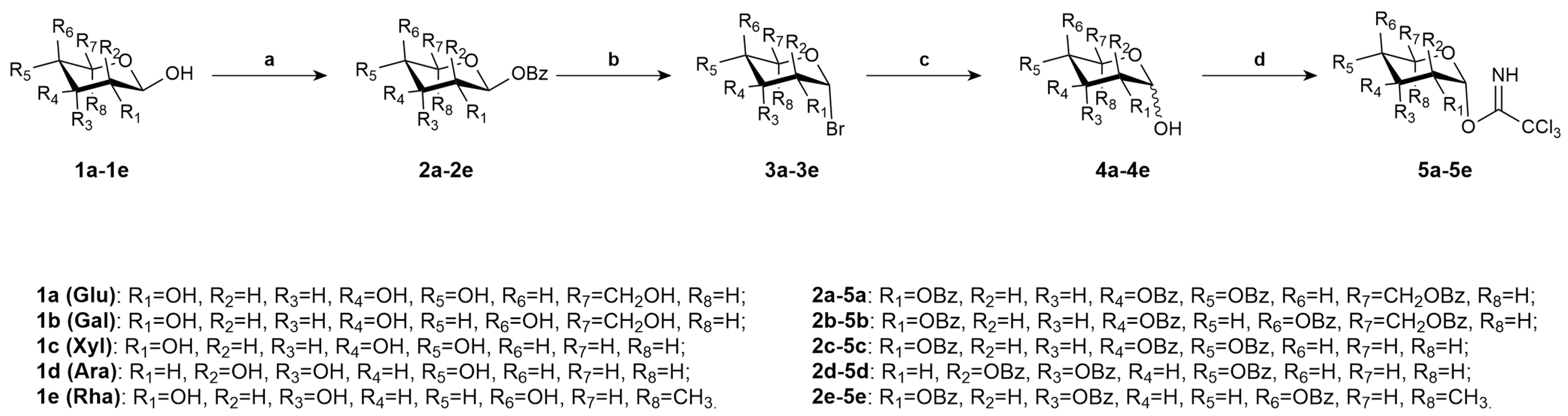 - Schmidt, R.R.; Michel, J. Facile synthesis of α- and β-O-Glycosyl Imidates; Preparation of Glycosides and Disaccharides. Angew. Chem. Int. Ed. Engl. 1980, 19, 731–732. [Google Scholar] [CrossRef]