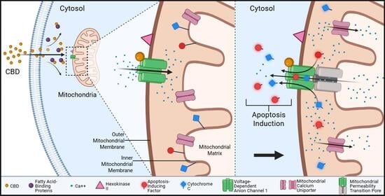 - Olivas-Aguirre, M.; Torres-López, L.; Valle-Reyes, J.S.; Hernández-Cruz, A.; Pottosin, I.; Dobrovinskaya, O. Cannabidiol directly targets mitochondria and disturbs calcium homeostasis in acute lymphoblastic leukemia. Cell Death Dis. 2019, 10, 779. [Google Scholar] [CrossRef] [PubMed]