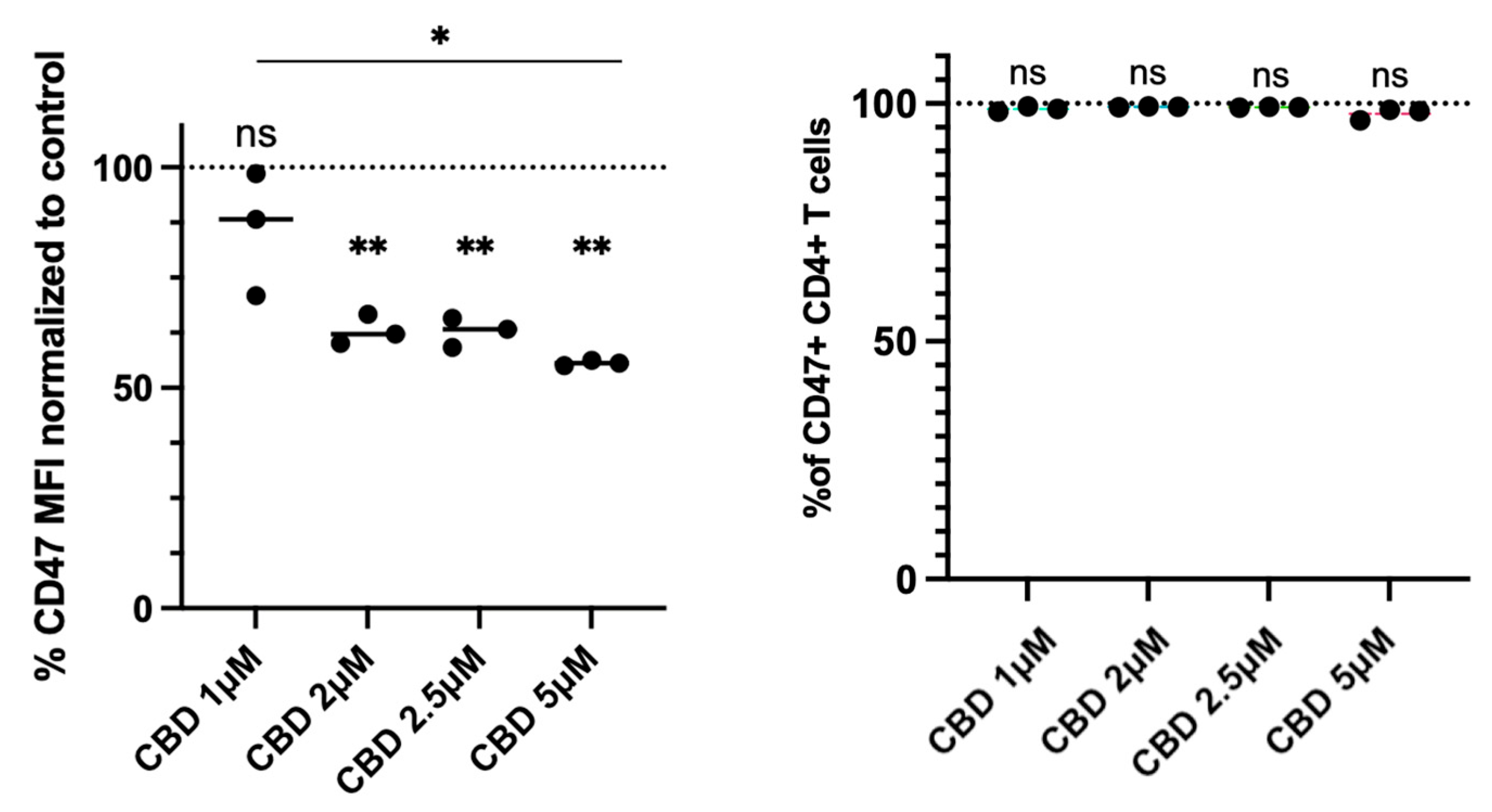 2.3. CBD Reduces CD47 Expression in Human Primary CD4+ T Cells