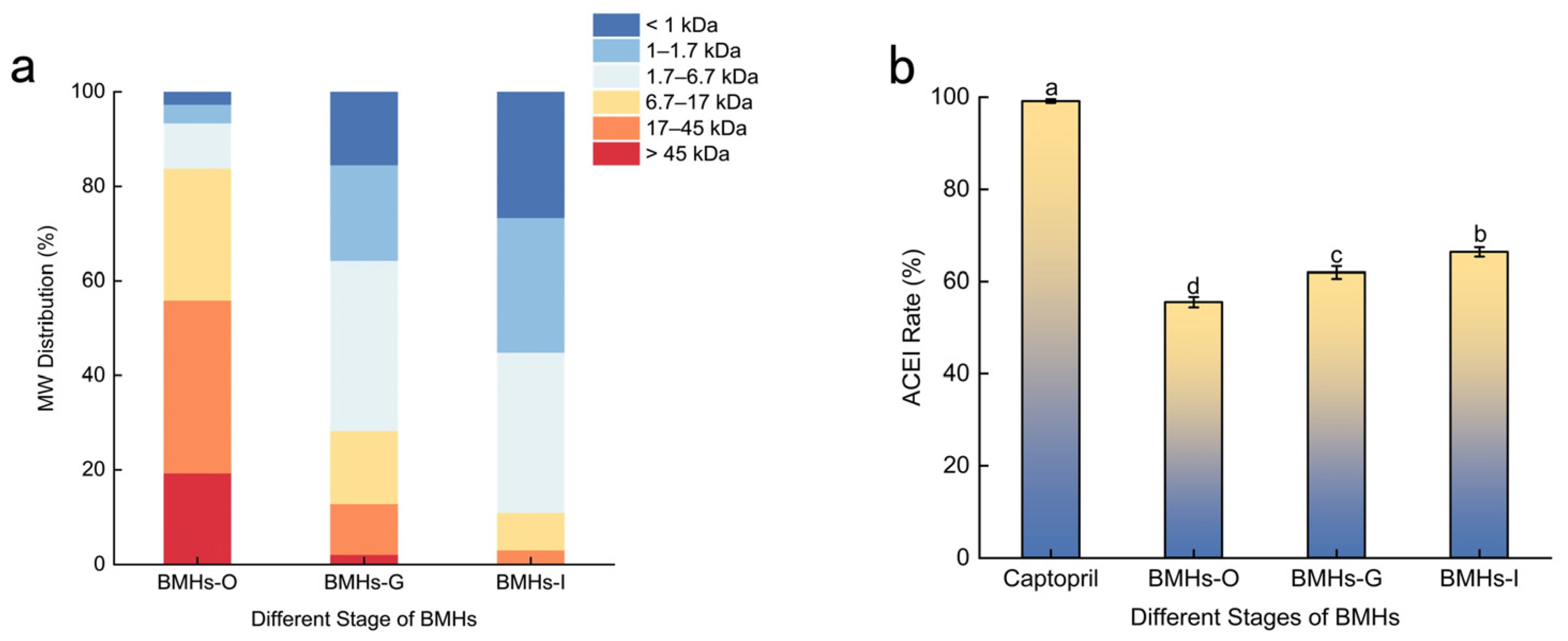 Figure 1b). The inhibition rate of BMHs-I was lower than that of the positive control, Captopril (99.2 ± 0.5%). This difference is likely because the hydrolysate is a mixture containing inactive substances, whereas Captopril is a pure compound. Importantly, the high activity of the control validates the performance of the assay. Furthermore, the activity of BMHs-I was markedly stronger than that of other animal protein hydrolysates; for instance, it was approximately 1.3 times more potent than earthworm hydrolysate (IC