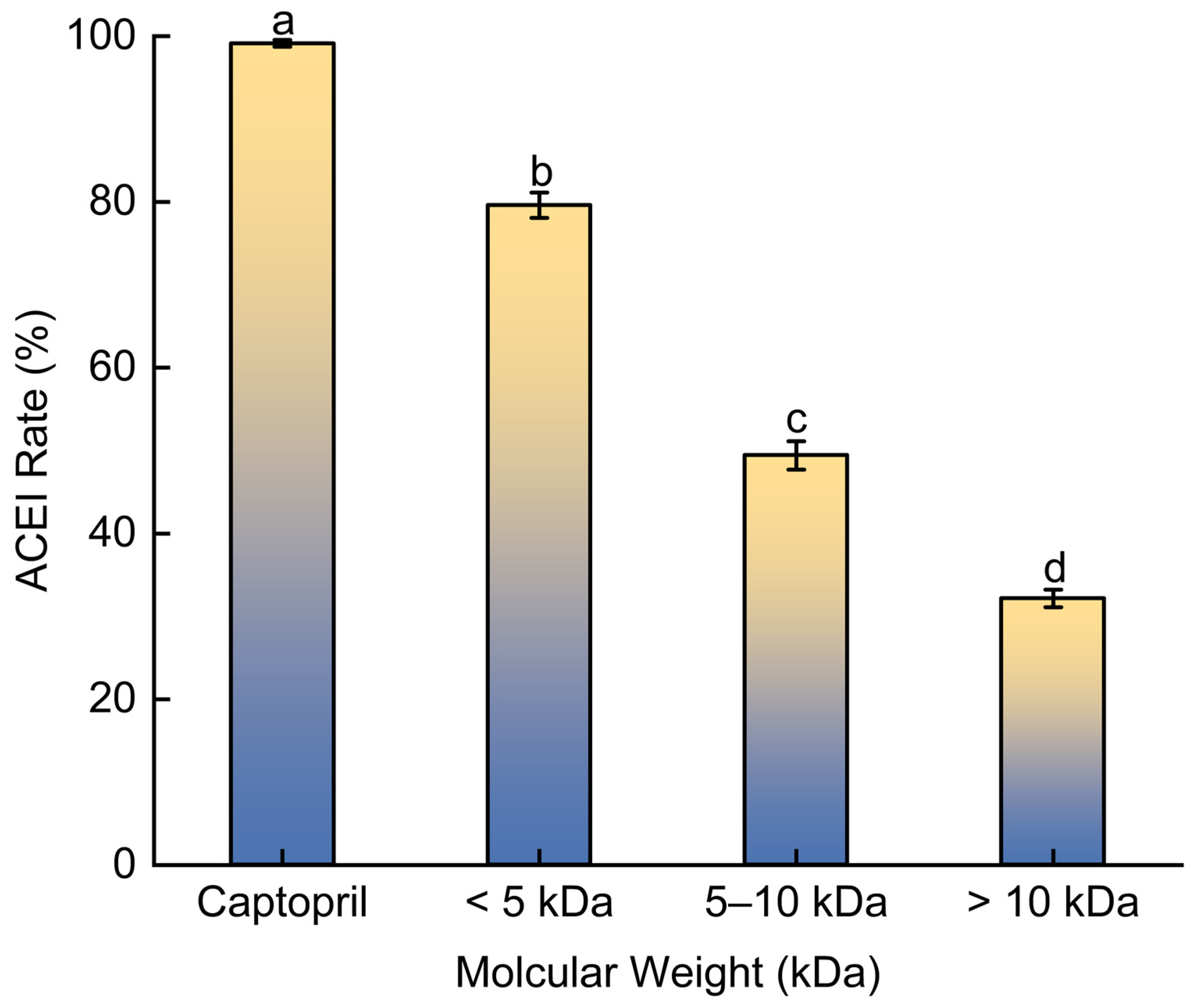 Peptide solutions (1 mg/mL) of varying molecular weights were incubated in a water bath at 20, 40, 60, 80 and 100 °C for 2 h. Subsequently, samples were cooled to 37 °C and centrifuged at 5000 rpm for 10 min. The ACE inhibitory activity of the collected supernatants was measured, using a solution kept at 37 °C as the control.