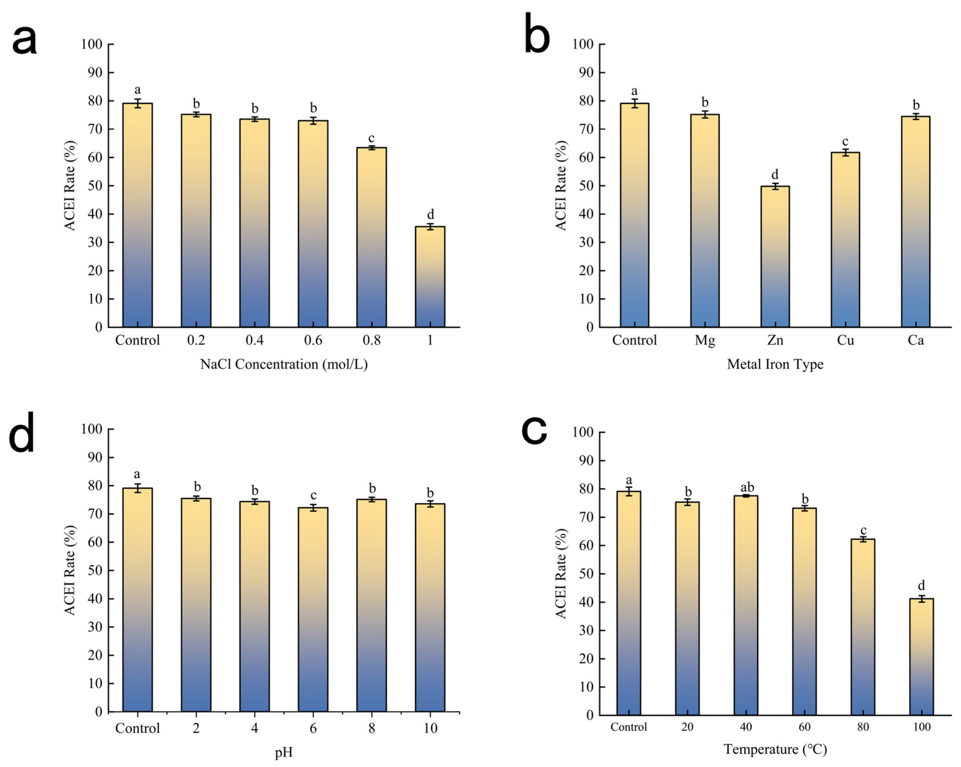 Figure 3b illustrates the effects of different metal ions on the ACE inhibitory activity of the BMHs-IU peptide solution. Control represents the activity measured in a solution without any metal ions. Ca