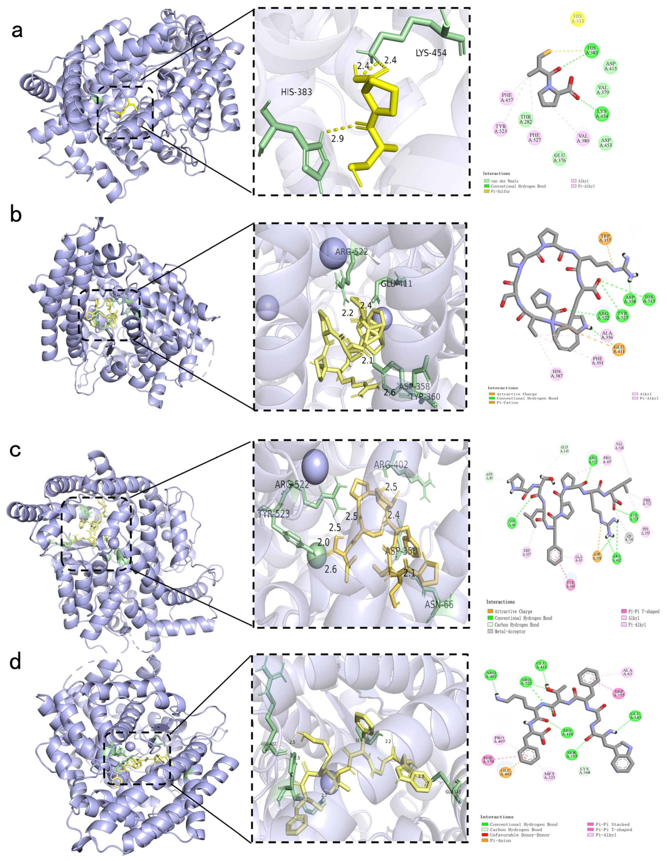 Figure 6a–d). The calculated binding energies were −11.1 kcal/mol for PPSPPRW, −10.4 kcal/mol for WGFTKF, and −9.9 kcal/mol for PSLFPPRL. These values were lower than those of Captopril (−5.5 kcal/mol), indicating stable binding. Furthermore, the binding affinity of these peptides was comparable to or more negative than those of other reported ACE-inhibitory peptides, such as FFFN (−9.6 kcal/mol) and FFDK (−8.6 kcal/mol) from