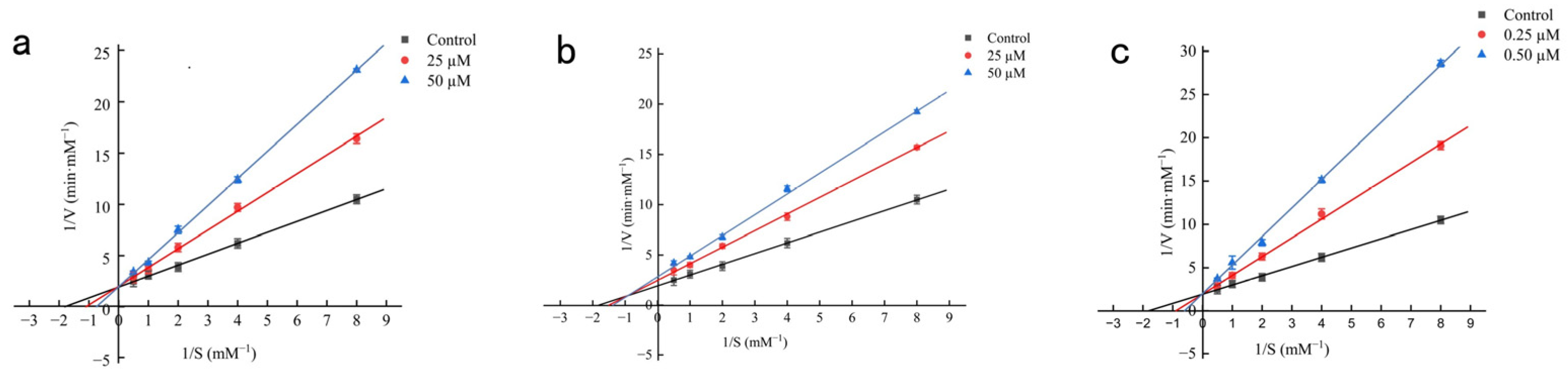 3.11. Determination of Inhibition Mode by Kinetic Analysis