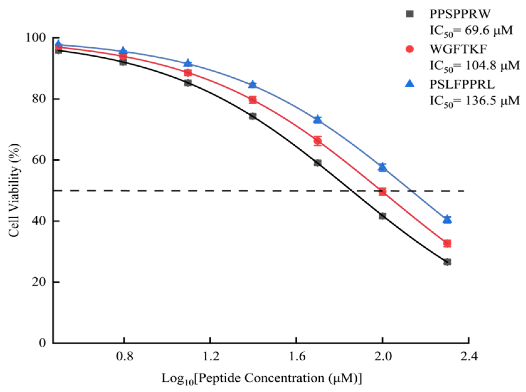 B. multicinctus exhibited a dose-dependent influence on cell viability. The calculated IC50 values for cytotoxicity were 69.6 µM (PPSPPRW), 104.8 µM (WGFTKF), and 136.5 µM (PSLFPPRL). Notably, at lower concentrations (<25 µM), the cell viability remained above 90%, indicating a functional safety margin. As shown in