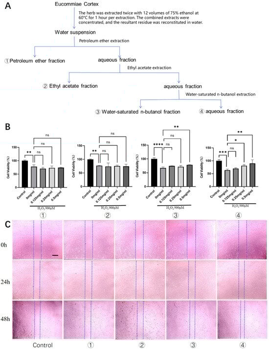 The concentrate was then diluted with distilled water to a total volume of 100 mL. A 10 mL aliquot of this solution was reserved as the total crude extract. The remaining 90 mL was sequentially partitioned with three solvents: petroleum ether, ethyl acetate, and water-saturated n-butanol. This process yielded four distinct fractions: ① the petroleum ether-soluble fraction, ② the ethyl acetate-soluble fraction, ③ the water-saturated n-butanol fraction, and ④ the aqueous fraction. The complete workflow is outlined in Figure 1A. Each of these four fractions was then concentrated by rotary evaporation at 60 °C under reduced pressure. The concentrates were transferred to evaporating dishes and left to dry completely in a fume hood.