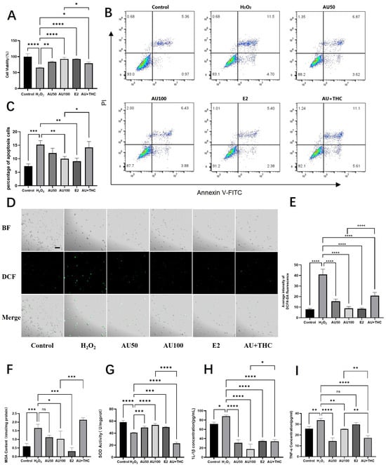 We next assessed apoptosis and necrosis using flow cytometry. H2O2 induction led to a significant increase in apoptotic and necrotic cells (Figure 3B,C). While 50 μM AU showed a decreasing trend, 100 μM AU and E2 significantly suppressed H2O2-induced cell death. The protective effect of 100 μM AU was again reversed by (R, R)-THC, further supporting the ER-mediated mechanism.