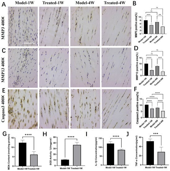 Aucubin regulates the expression of proteases, oxidative stress, and cytokine markers in tendinopathy tissue. (A,B) Immunohistochemical (IHC) analysis of Matrix Metalloproteinase-3 (MMP-3): (A) representative images and (B) integrated optical density (IOD) quantification (n = 6). (C,D) IHC analysis of Matrix Metalloproteinase-13 (MMP-13): (C) representative images and (D) IOD quantification (n = 6). (E,F) IHC analysis of Cleaved Caspase-3: (E) representative images and (F) IOD quantification (n = 6). (G–J) Effects of AU on the levels of (G) malondialdehyde (MDA), (H) superoxide dismutase (SOD) activity, (I) IL-1β and (J) TNF-α in tendon tissue (n = 6). Scale bars: 100 μm (A,C,E). Data are presented as mean ± SD. ns, not significant; ** p < 0.01, *** p < 0.001, **** p < 0.0001.