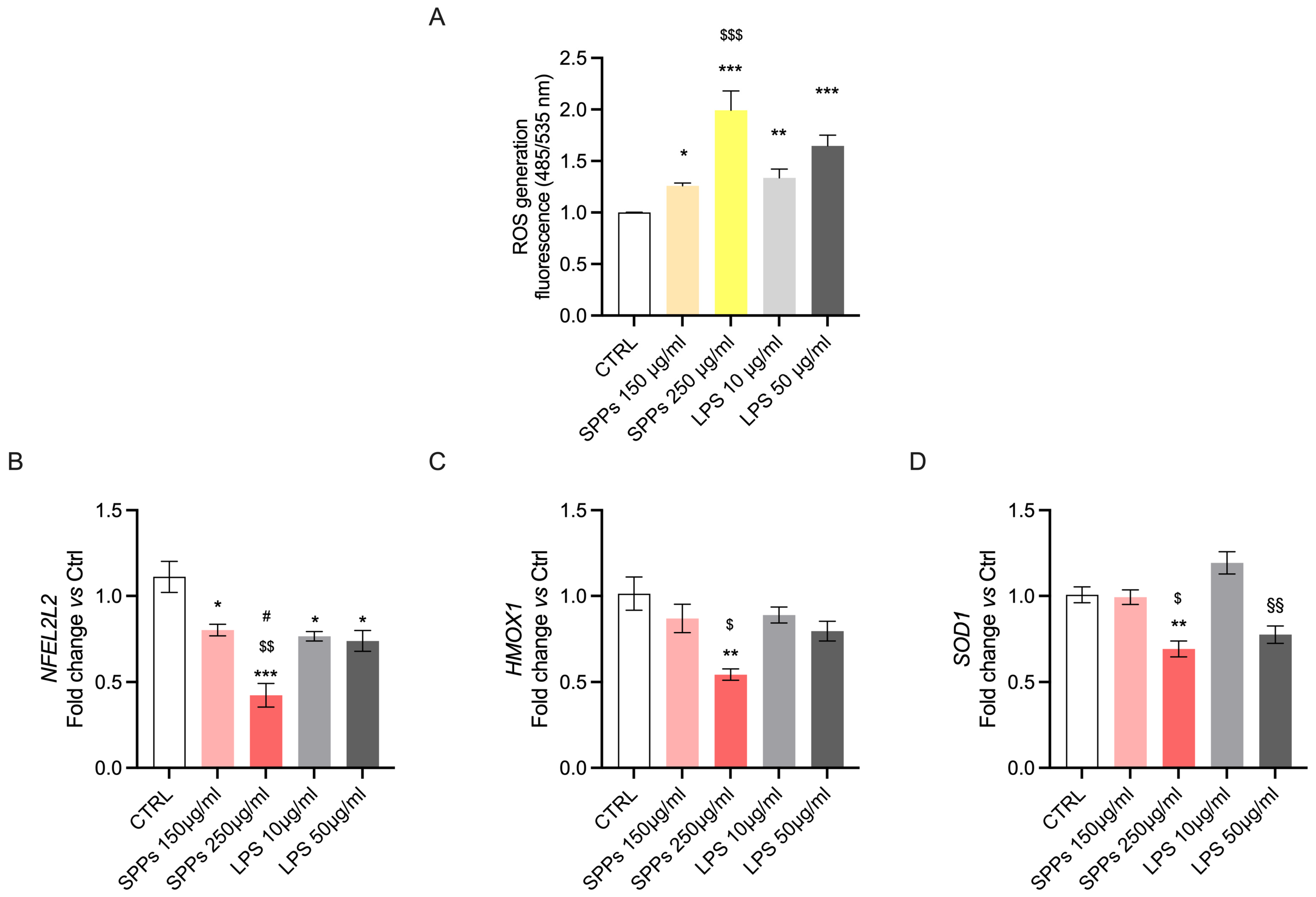 2.3. SPPs Induce Oxidative Stress in A549 Cancer Cells by Increasing ROS Levels and Downregulating Antioxidant Gene Expression