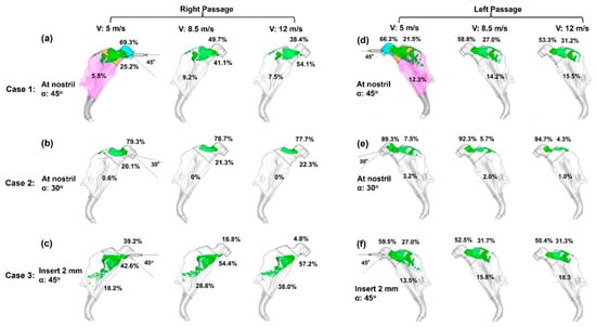 Considering the right nasal passage (Figure 3a), large discrepancies are observed among the three cases, indicating a significant impact from the spray release position and orientation. The droplet exit velocity is observed to exert a smaller impact on the deposition pattern, which appears to be velocity-independent when V ≥ 8.5 m/s (Figure 3a–c). However, a quantitative comparison of regional deposition fractions reveals dose shifts with velocity in each case despite their visual resemblance. In Case 3 (Figure 3c), the vestibular deposition fraction (DF) decreases from 39.2% for V = 5 m/s, to 16.8% for V = 8.5 m/s, and to 4.8% for V = 12 m/s; meanwhile, the turbinate DF correspondingly increases from 18.2% to 28.8% to 38.0%. In Case 1, 5.5–9.2% reaches the turbinate’s right passage, (Figure 3a), while in Case 2, almost no sprays reach that region (Figure 3b). Both cases dispense lower doses to the turbinate than Case 3 for both right and left passages.