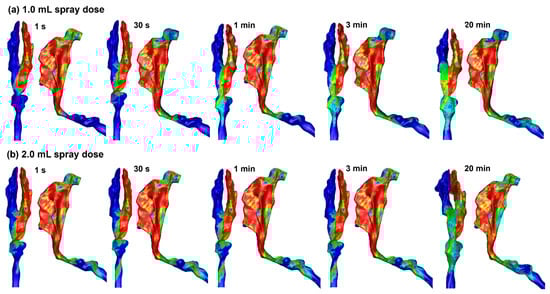 Figure 5 shows the liquid film evolution after spraying 1.0 mL and 2.0 mL doses into the right nasal passage. Clearly, the nasal mucosa cannot hold the applied dose even though nearly all nasal walls have reached their holding capacities. The liquid film moves, driven by gravity while hurdled by wall shear and surface tension, into the nasopharynx, pharynx, and even the throat. These runoffs can trigger adverse responses such as a sense of bitterness, coughing, or choking. Because both the 1.0 mL (Figure 5a) and 2.0 mL (Figure 5b) doses exceed the nasal wall holding capacity, the liquid film distributions appear similar between these two spray doses.