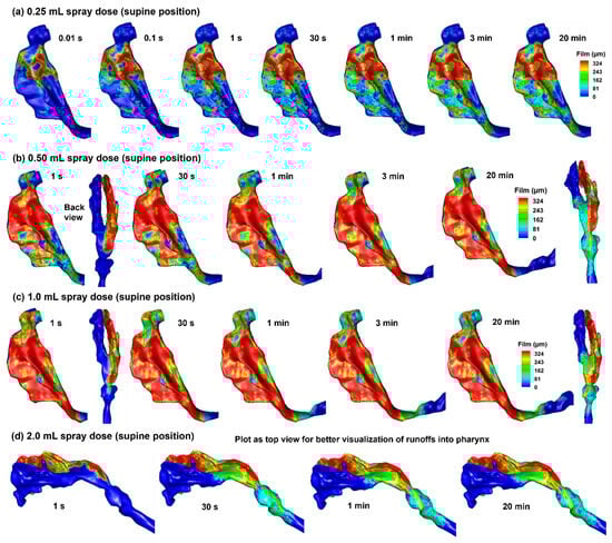 Simulations were also conducted for spray distributions in the 10-day-old nose model in a supine position with spray doses of 0.25 mL, 0.50 mL, 1.0 mL, and 2.0 mL, as shown in Figure 6a–d. With a spray dose of 0.25 mL (Figure 6a), the liquid film stabilizes at 1 s and exhibits no significant variation after that. No runoff into the pharynx is observed in this case, even though spray droplets are noted in the nasopharynx (Figure 6a). For a spray dose of 0.50 mL (Figure 6b), the liquid film appears to stabilize at 1 s; however, subtle changes in the liquid film can also be observed after that. Significant deposition is observed in that nasopharynx (NP), with an appreciable fraction entering the pharynx and larynx (Figure 6b). The liquid film development with a spray dose of 1.0 mL appears similar to that with 0.50 mL, except that the film spreads earlier into the pharynx region (Figure 6c vs. Figure 6b).