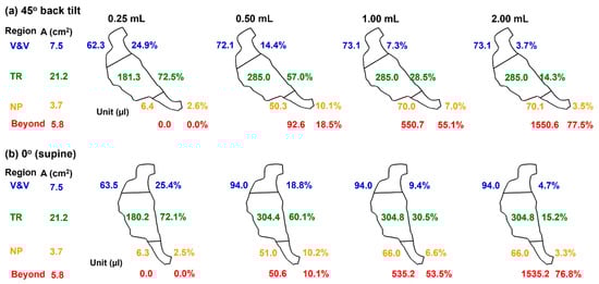 A summary of delivered doses in different anatomical regions is presented in Figure 7, including the nasal vestibule and valve (V&V), the turbinate region, the nasopharynx (NP), and beyond (pharynx and larynx). The doses in the turbinate are colored green, indicating the targets. By contrast, the doses in the NP are colored brown, and those beyond are colored red, indicating the conditions that should be avoided and must be avoided, respectively. Runoffs become apparent beginning with the spray dose of 0.50 mL. The deposition fraction (DF) beyond the NP is 18.5% in the 45° back tilt position and 10.1% in the supine position. Moreover, excess spray volumes in the 1.0 mL and 2.0 mL cases all enter the pharynx, regardless of the body position, indicating that the 0.50 mL spray dose has exceeded the liquid-holding capacity of the right passage of this infant nose model.
