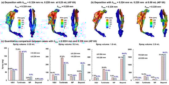 Comparison of dose distributions predicted with hmax = 0.324 mm vs. hmax = 0.220 mm in a 45° back tilt position: (a) final deposition distributions with a 0.25 mL dose, (b) final deposition distributions with a 0.50 mL dose, and (c) quantitative comparison of regional deposition for applied spray volumes of 0.25 mL, 0.50 mL, 1.0 mL, and 2.0 mL.