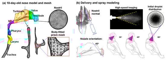 Nasal model and computational methods: (a) 10-day-old female nose geometry and computational mesh, and (b) modeling of intranasal delivery and spray administration.