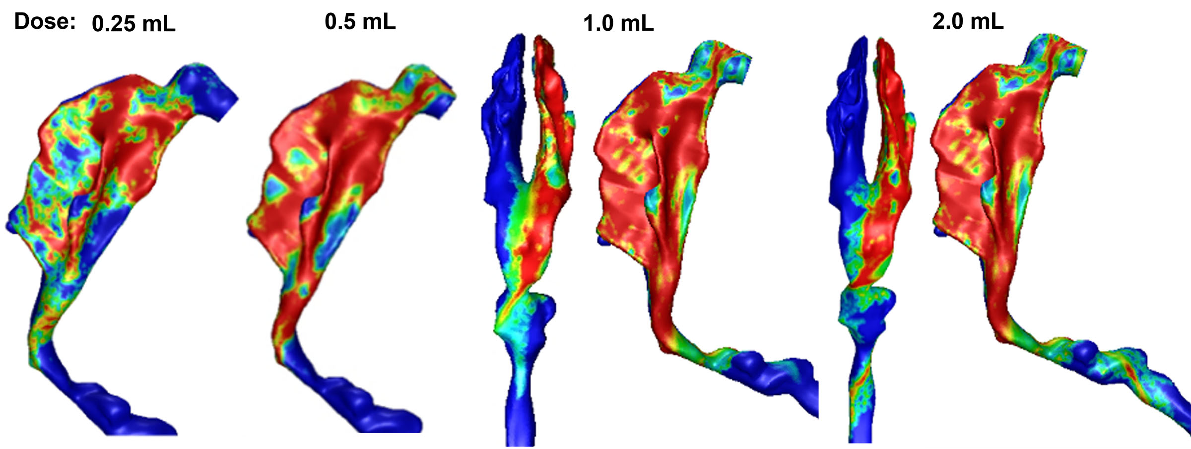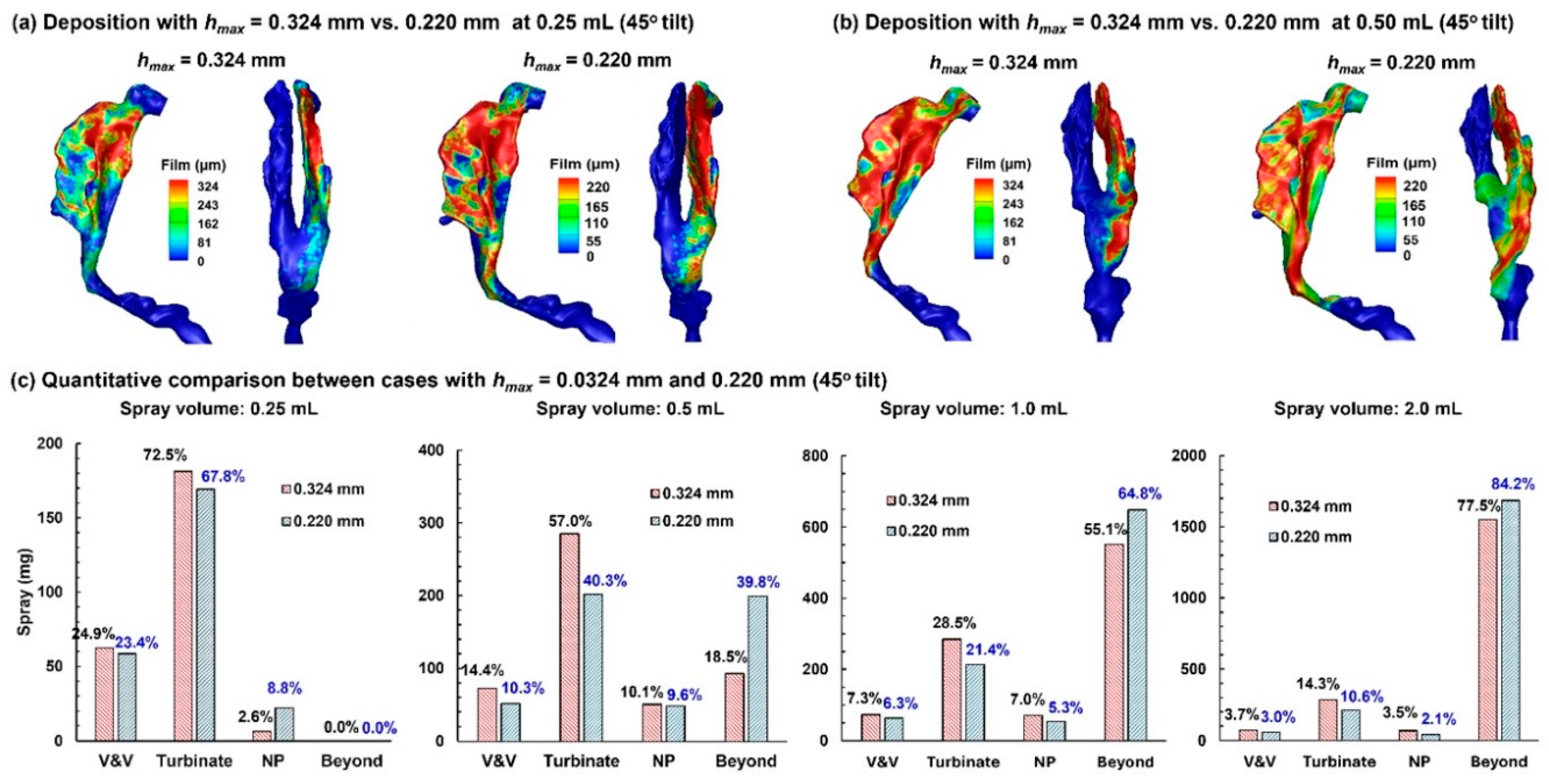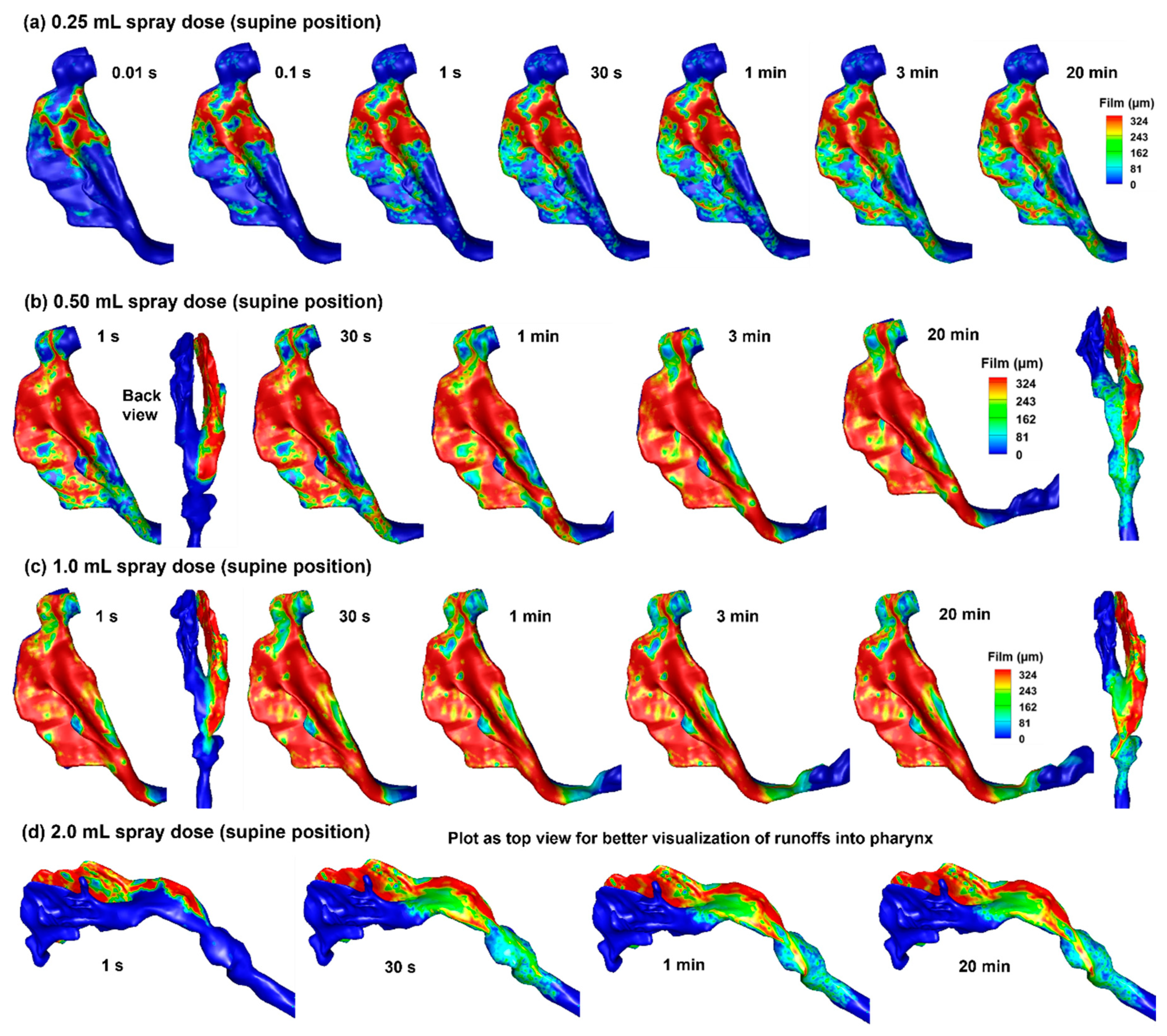 - To simulate post-deposition liquid translocation and quantify runoff after applying sprays of 0.25 mL, 0.50 mL, 1.0 mL, and 2.0 mL in 45° back tilt and supine positions.