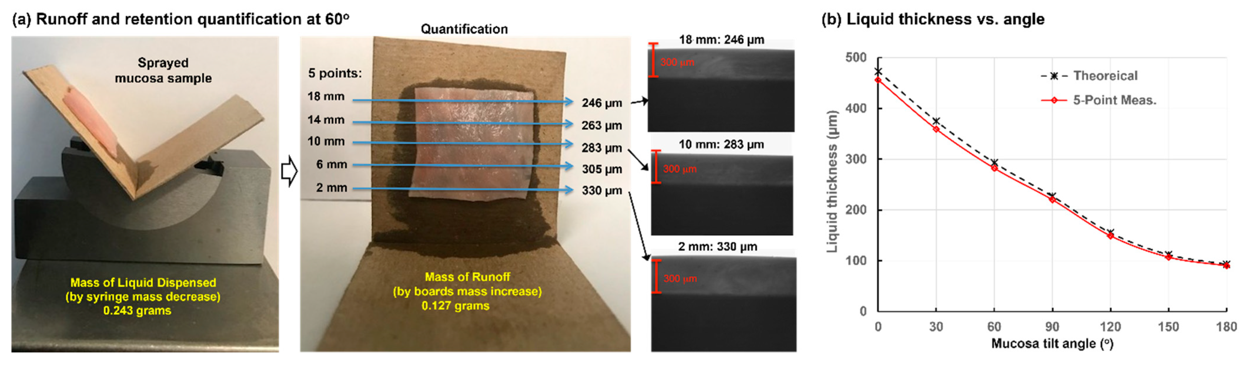 4.2. Measurement of Retained Liquid Layer Thickness vs. Tilt Angle on Porcine Nasal Mucosa