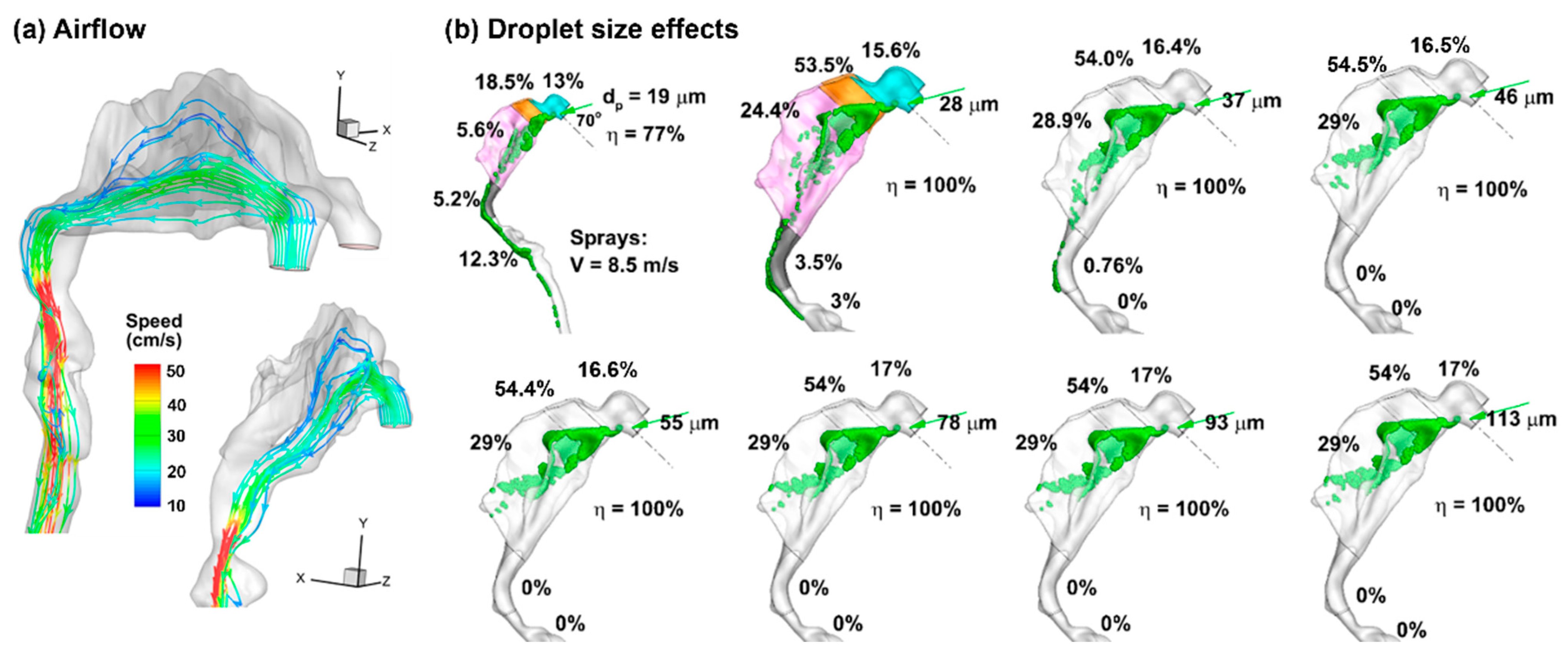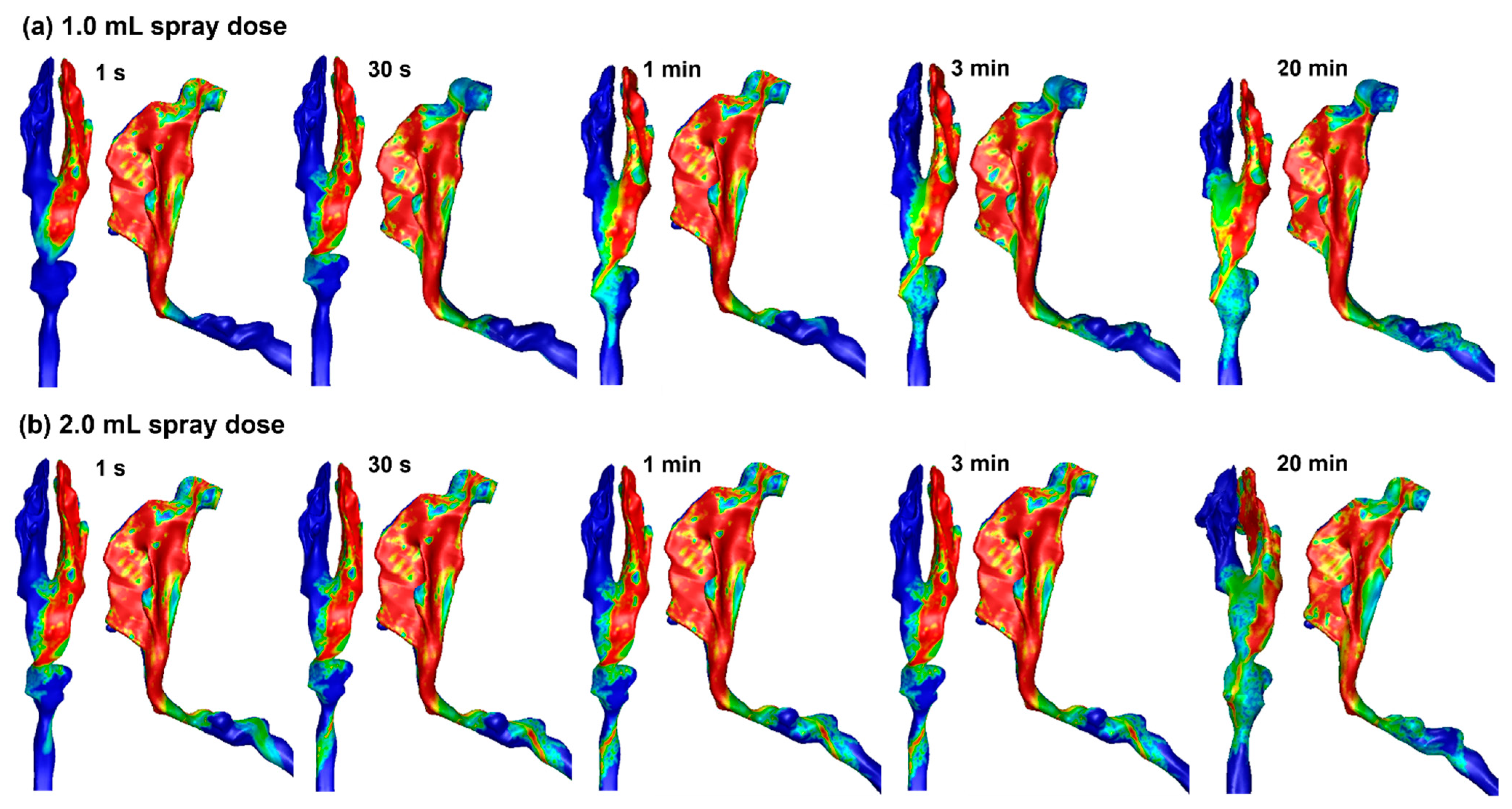 - Seifelnasr, A.; Si, X.; Zhang, J.Y.; Luo, M.Z.; Lei, R.L.; Xi, J. Improving nasal spray deposition: Advances and strategies to overcome anatomical and physiological barriers. Expert Opin. Drug Deliv. 2025, 22, 1895–1914. [Google Scholar] [CrossRef]