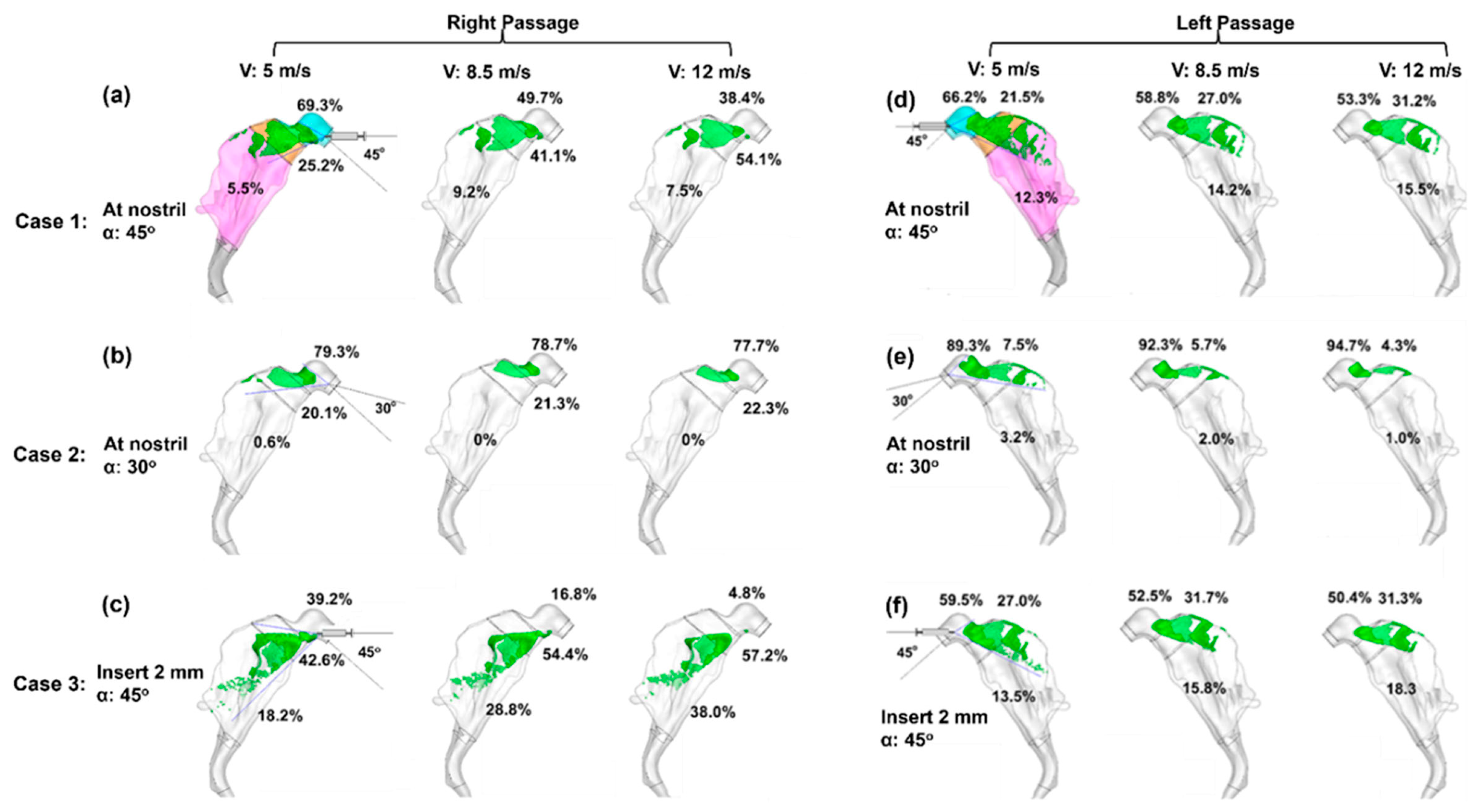 - Calmet, H.; Inthavong, K.; Eguzkitza, B.; Lehmkuhl, O.; Houzeaux, G.; Vázquez, M. Nasal sprayed particle deposition in a human nasal cavity under different inhalation conditions. PLoS ONE 2019, 14, e0221330. [Google Scholar] [CrossRef]