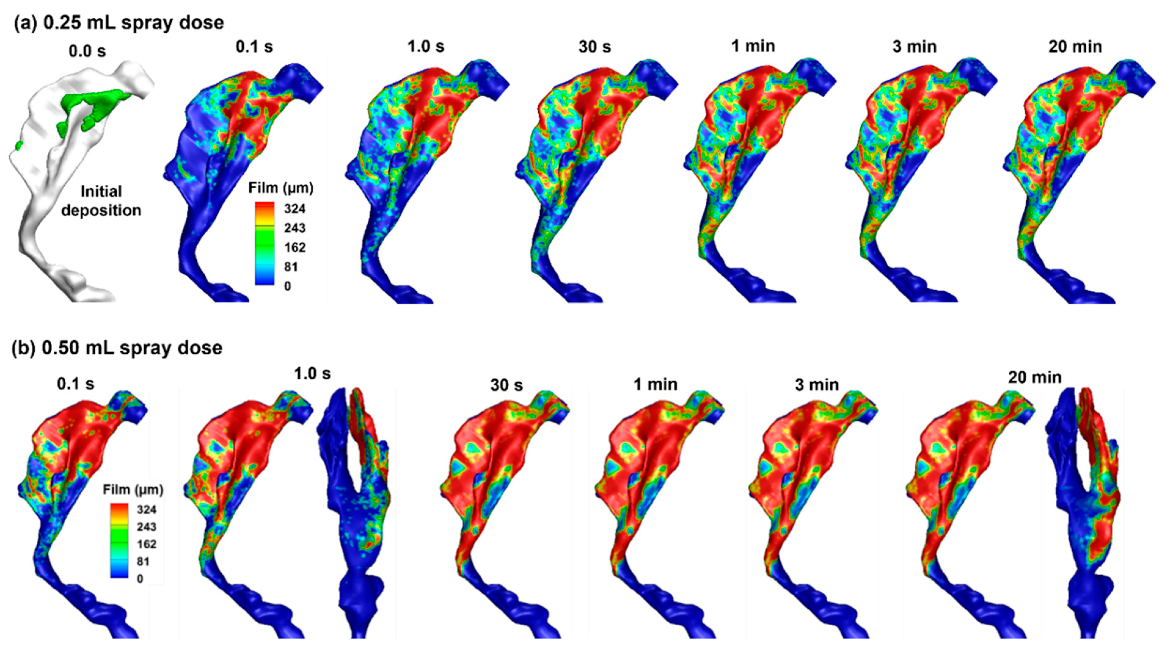 - Si, X.A.; Sami, M.; Xi, J. Liquid film translocation significantly enhances nasal spray delivery to olfactory region: A numerical simulation study. Pharmaceutics 2021, 13, 903. [Google Scholar] [CrossRef]