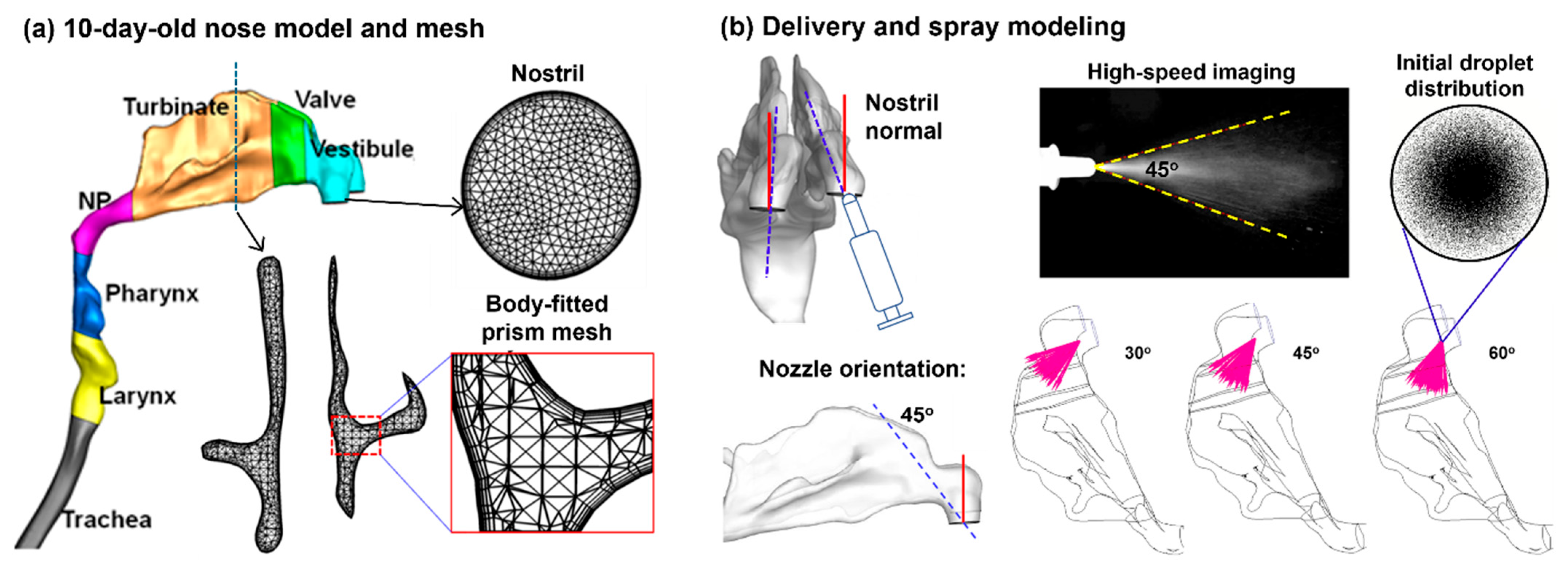 - To simulate the initial deposition distribution in a 10-day-old nasal model under varying parameters related to device (plume angle, exit velocity, and droplet size distribution), delivery (insertion depth, nozzle angle, and dose), and patient (body position).