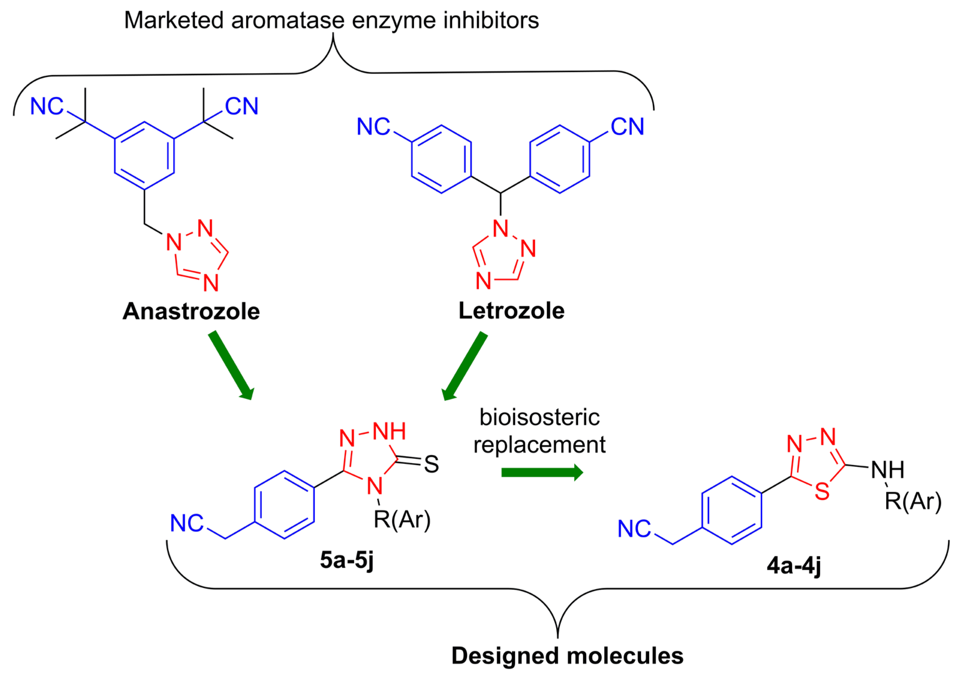 - Rashdan, H.R.M.; Shehadi, I.A. Triazoles Synthesis & Applications as Nonsteroidal Aromatase Inhibitors for Hormone-Dependent Breast Cancer Treatment. Heteroat. Chem. 2022, 2022, 5349279. [Google Scholar] [CrossRef]