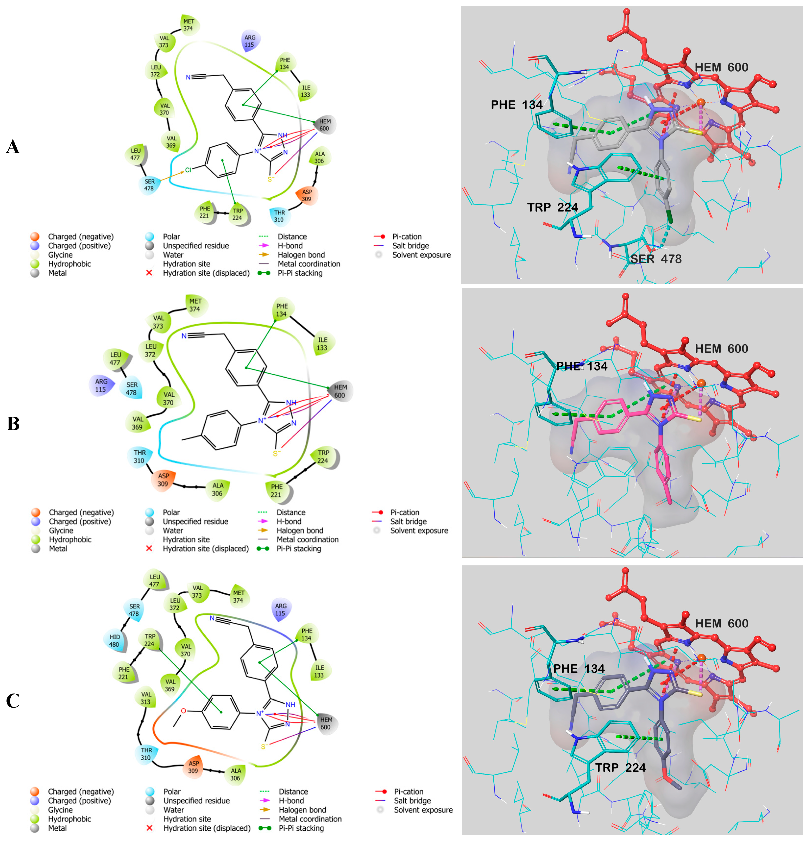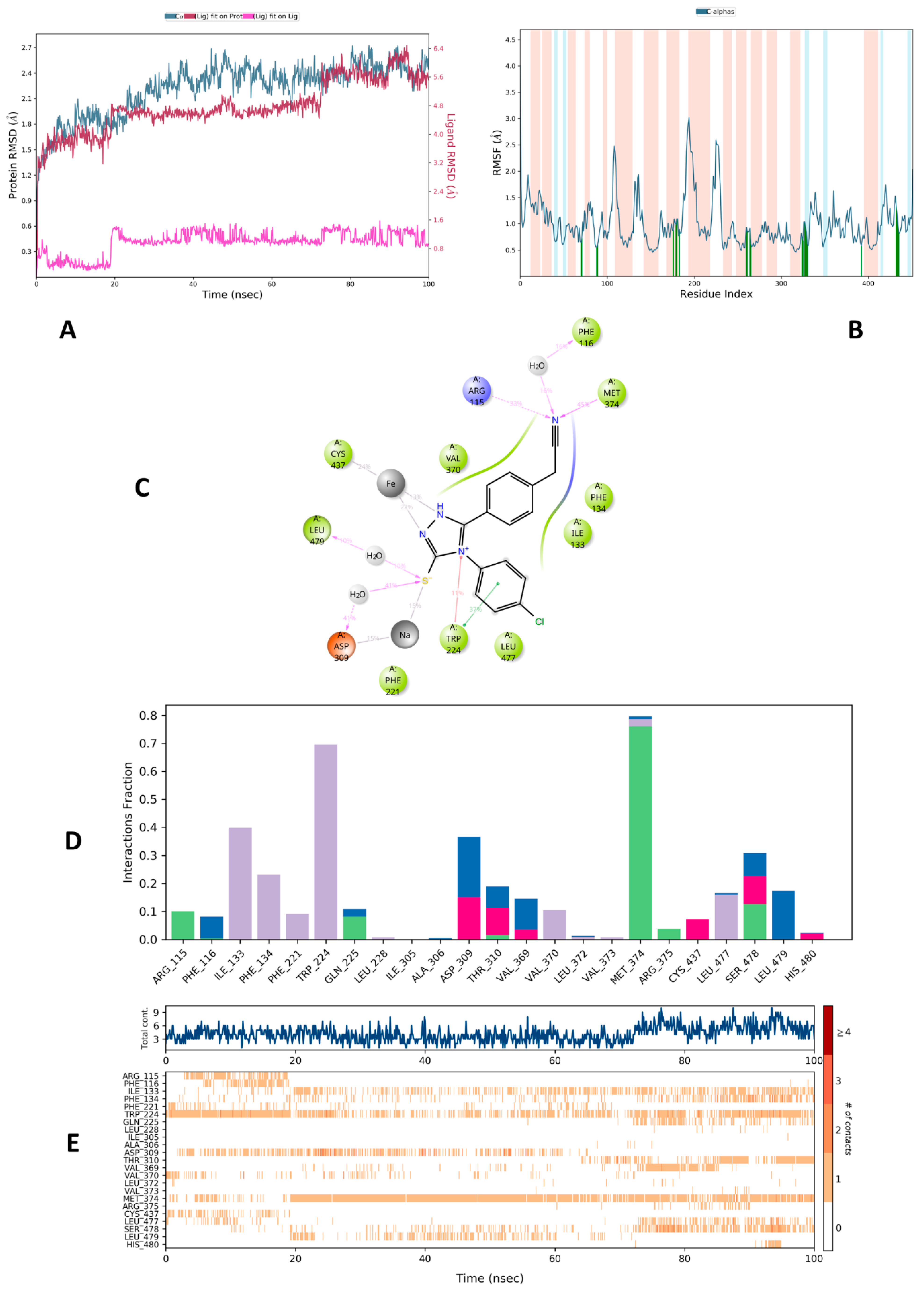 | 5c-3EQM | Arg115 (H-bond: 33%) Phe116 (Water mediated H-bond: 16%) Trp224 (π-π interaction: 37%) Trp224 (Cation-π interaction: 11%) Asp309 (Water mediated H-bond: 41%) Met374 (H-bond: 45%) Leu479 (Water mediated H-bond: 10%) HEM (Metal coordination 13% and 22%) | Water mediated H-bond (blue) Phe116, Gln225, Ala306, Asp309, Thr310, Val369, Leu372, Met374, Leu477, Ser478, Leu479, His480 |