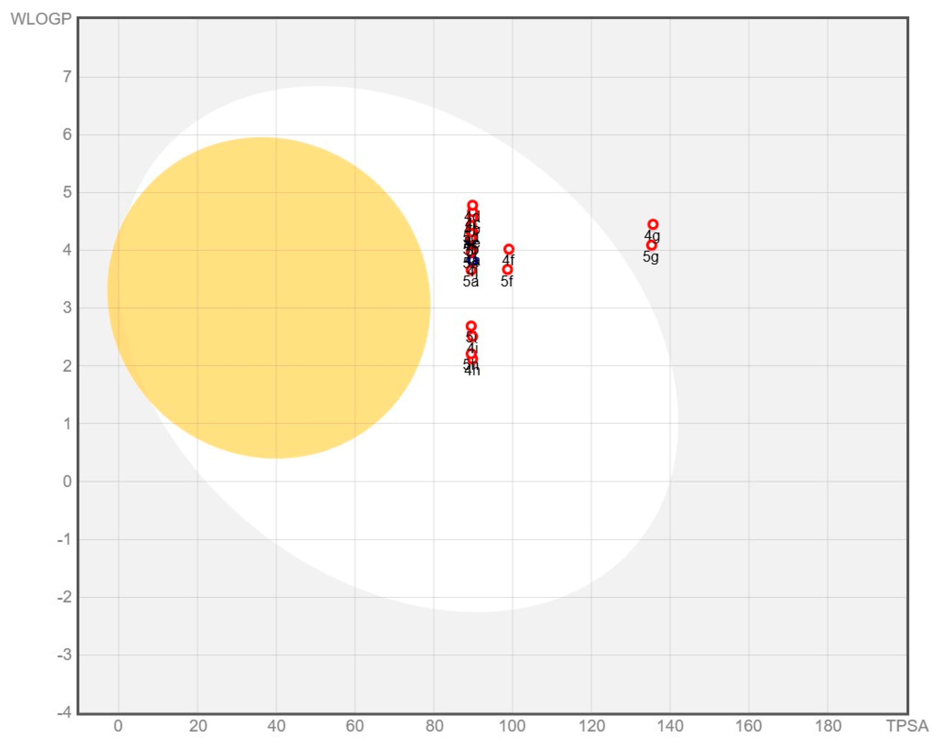 | 4a | 292.36 | 4 | 3 | 1 | 89.84 | 2.55 | −4.23 | Yes | Yes | Yes | Yes | Yes |
