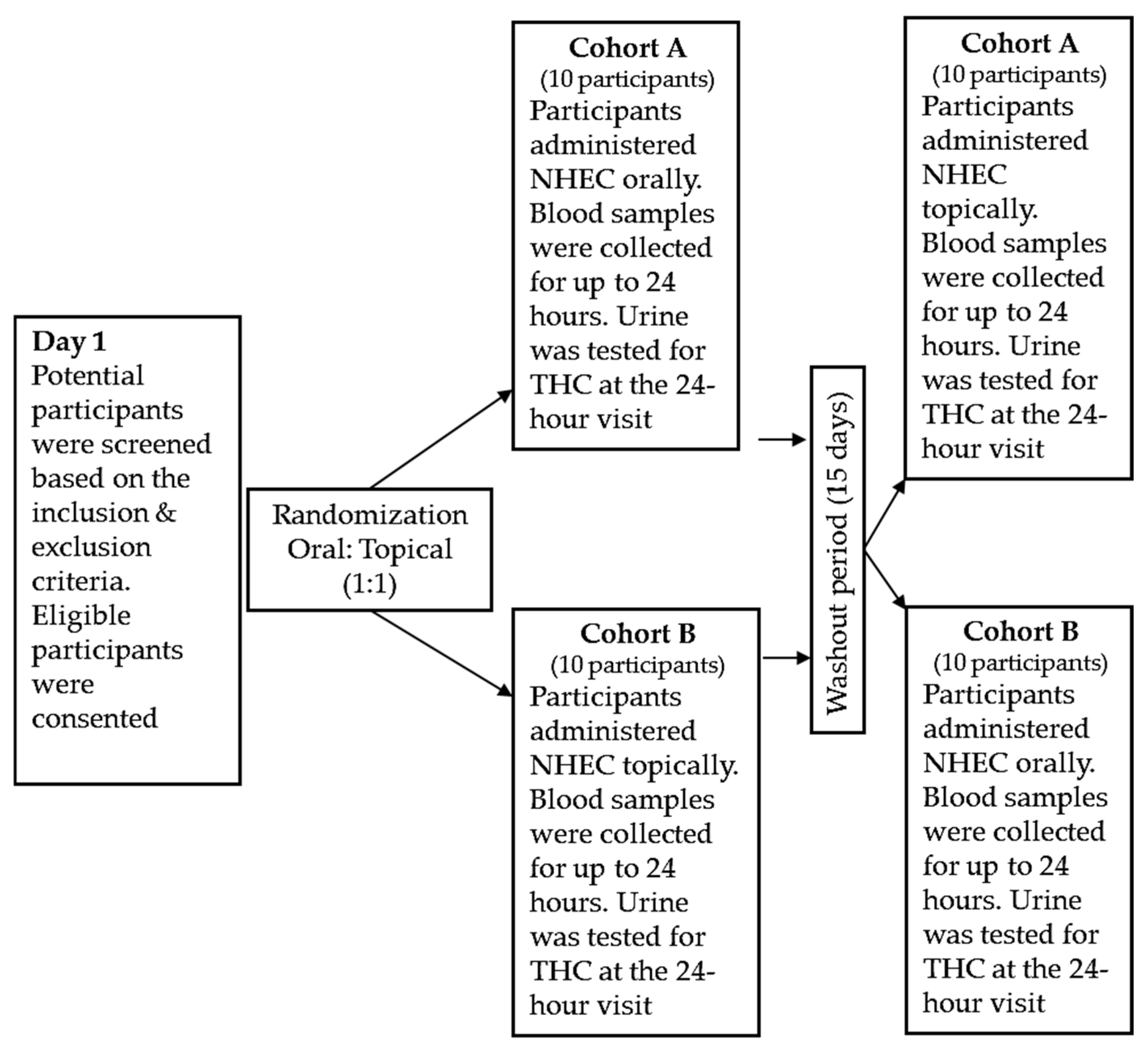 Since general consumers may use oil-based hemp cosmetics as topical cream or as dietary supplements, this exploratory feasibility crossover study intended to characterize the PK of the concentrations of CBD, THC, and their metabolites in the plasma of healthy volunteers receiving a single topical or oral dose of a natural hemp extract-based cosmetic (NHEC) consisting of CBD and medium-chain triglycerides (MTC) derived from coconut oil. The secondary outcomes of the study were: (i) to calculate the bioavailability of the NHEC following topical or oral administrations using the published bioavailability data, (ii) to determine whether the participants who used an NHEC would have positive urine THC tests.